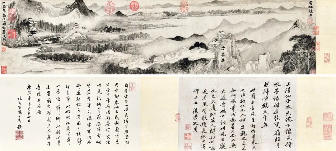 画卷初开,始以几棵苍天古松,浓墨写就,生趣盎然。画面末端,丛树间现几座屋宇,似乎是道观所在。此画从表面上看系水墨云山烟树,实际为方从义绘道教第三十二福地龙虎山及上清宫等宫观。他所题《云林钟秀》即已说明所绘为“天地间灵秀之气所聚”。方从义是道士兼画家,《老子》有云:“惚兮恍兮,其中有象;恍兮惚兮,其中有物;窈兮冥兮,其中有情;其精甚真,其中有信”他的绘画正是道法与艺术的精妙结合。