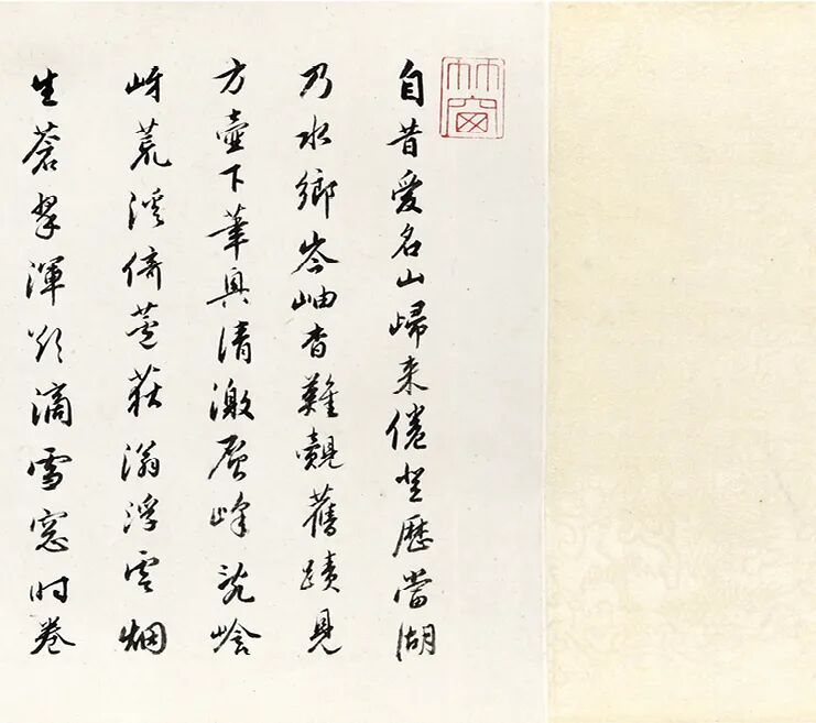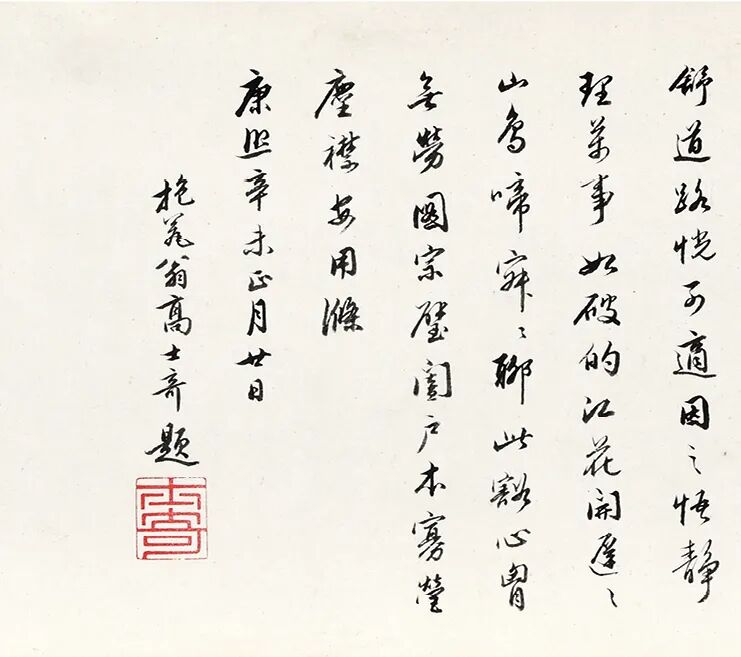 2.自昔爱名山,归来倦登历。当湖乃水乡,岑岫杳难觌。旧迹见方壶,下笔兴清激。层峰乱含岈,荒溪倚芦荻。滃浮云烟生,苍翠浑欲滴。雪窗时卷舒,道路恍可适。因之悟静理,万事如破的。江花开迟迟,山鸟啼寂寂。聊此豁心胸,无劳图宗壁。阖户本寡莹,尘襟安用涤。康熙辛未正月廿日,抱瓮翁高士奇题。钤印:士奇、竹窗