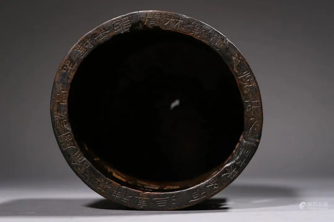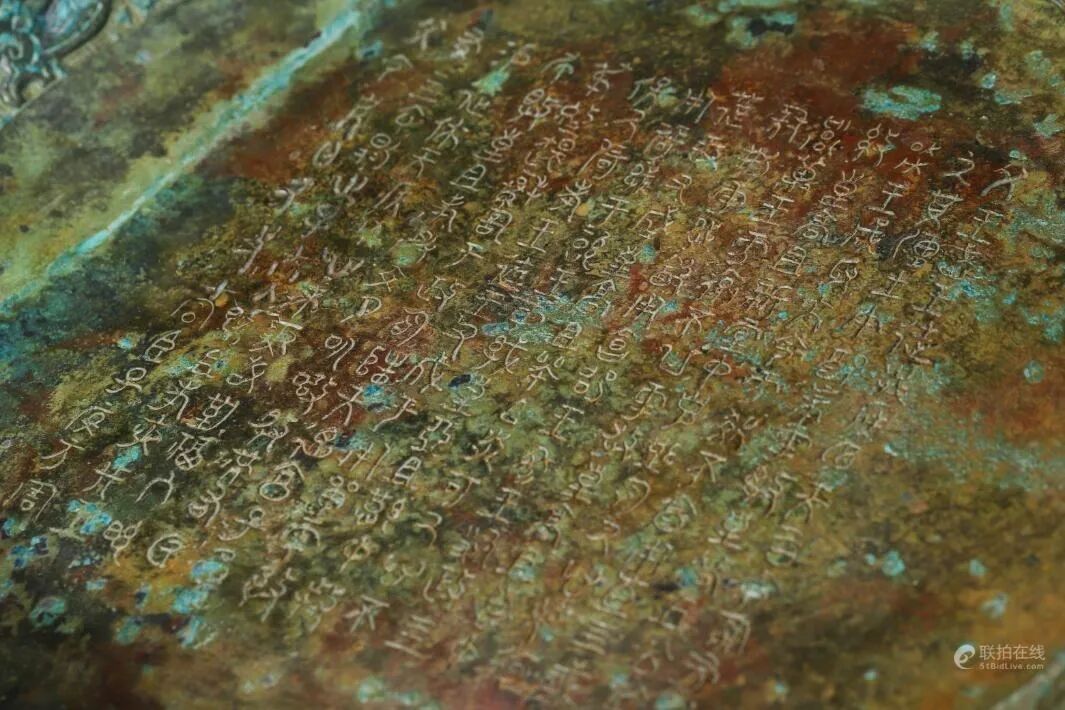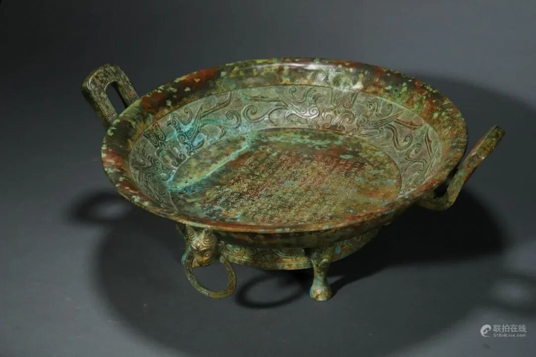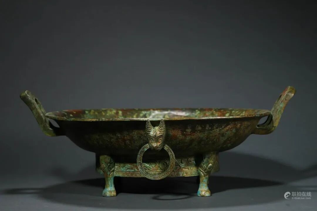 器物精铜铸造,敞口外撇,鼓腹下渐收,下承四足。胎壁薄厚均匀,造型古朴端庄,雅致而不失神韵。口沿下铸饰对称的朝冠耳,线条流畅自然,弧度精美雅致,内壁錾刻各式的凤鸟纹装饰,以回纹作地,雕刻精准细腻,动感十足,生动逼真。内底和外壁錾刻铭文,下刀坚实有力,字体洒脱工整,外壁铸饰对称的铺首衔环耳,兽面生动形象,凸目咧嘴。底足一圈紧密的回纹装饰衬托,兽足刻画生动,构思新颖巧妙。整器造型敦实有力,线条流畅自然,收放自如,婉转秀挺,彰显典雅华贵。工艺复杂繁复,刻工精湛娴熟,纹饰布局清晰有序,层次分明。久经传承皮壳包浆醇厚莹润,收藏价值颇高。