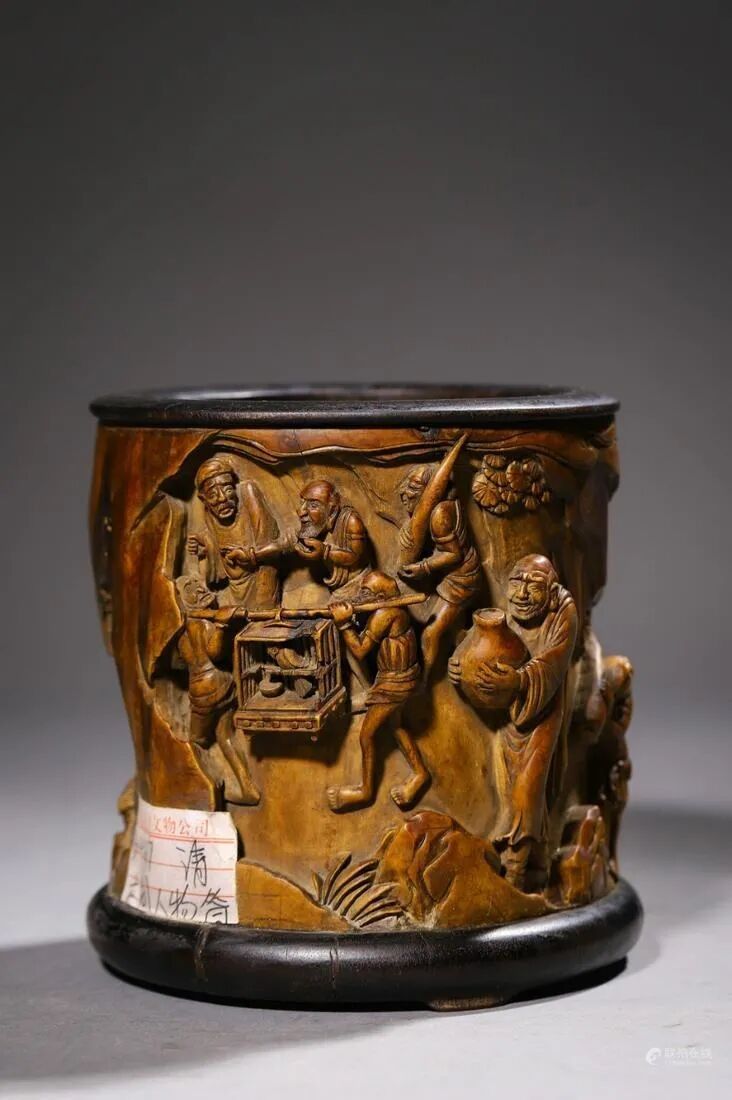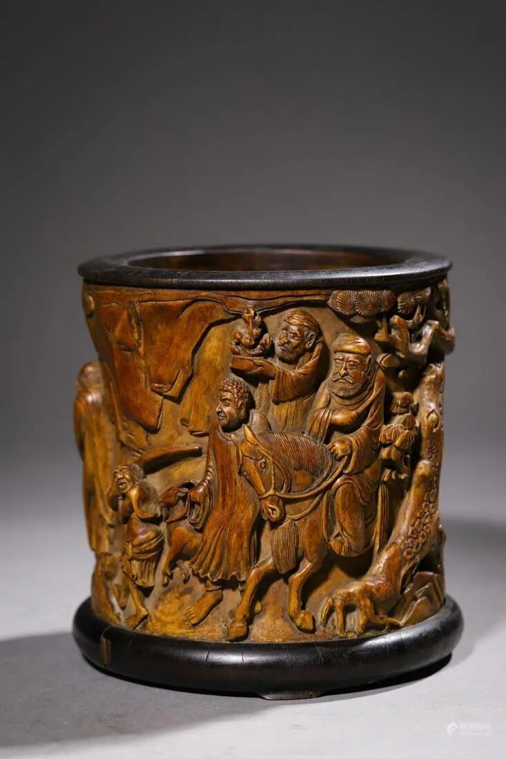笔筒以珍贵的黄杨木为材,采用整木挖成,木质坚实细腻,硬度适中,色泽雅美,纹理明晰自然。本品平沿口,直筒式腹,上下等宽,造型简练端庄,平添几分天然韵致。筒壁浅刻胡人献宝画面装饰,线条隽永洒脱,崖柏蜿蜒遒劲,极具生命力。胡人面部表情雕刻精准细致,表情丰富,神形兼备,栩栩如生,尽显热闹喜庆氛围。转动观之,气韵连贯,布局错落有序,活灵活现,极具动感。整器工巧精研,留壁薄厚适中,形制端庄大气而不失文雅,久经盘玩传承,内外包浆自然醇厚。内壁处理光滑圆润,熟练的雕工与笔筒的呈色相映成趣,简约雅致,工艺精细,呈现清代文人的美学艺术,实为文房佳品。
