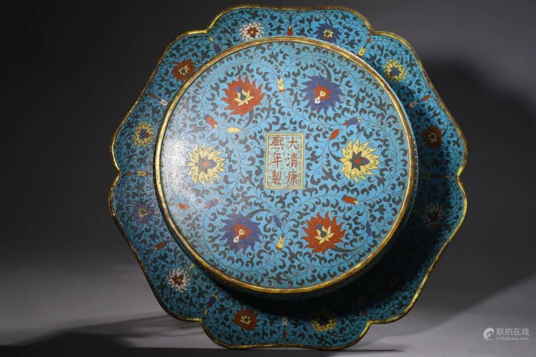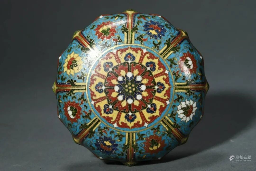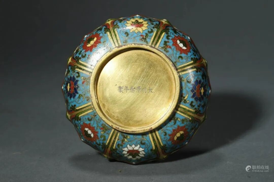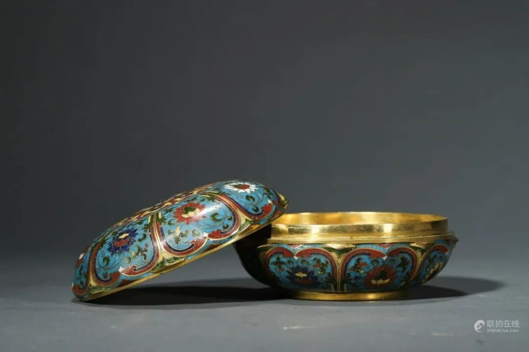 盖盒以精铜铸造而成,胎体厚实。盖与盒身以唇边式子母口相合,衔接紧实,下承圈足,形体饱满周正,清雅怡人。器身外壁施天蓝色珐琅釉为地,以掐丝珐琅技法勾勒出莲瓣纹饰,其内勾勒绘饰缠枝花卉图案衬托,填充红、黄、褐、白、黑等色珐琅彩料。盖面正中绘饰莲瓣纹与其外壁纹饰相呼应,莲瓣饱满肥厚,规整有致,更添神韵。画面纹饰设色纯正雅致,莲花绽放盛开,缠枝纹翻卷自然,线条流畅婉转,娇艳鲜亮。唇沿、內膛及底部均予以鎏金。底足中央施刀錾刻大明景泰年制六字楷书款识,下刀苍劲有力,字体工整洒脱。整器铜质精纯,釉色饱满妍丽,鎏金灿然,图样布局井然有序,做工细致,气韵华美,悦目怡情。
