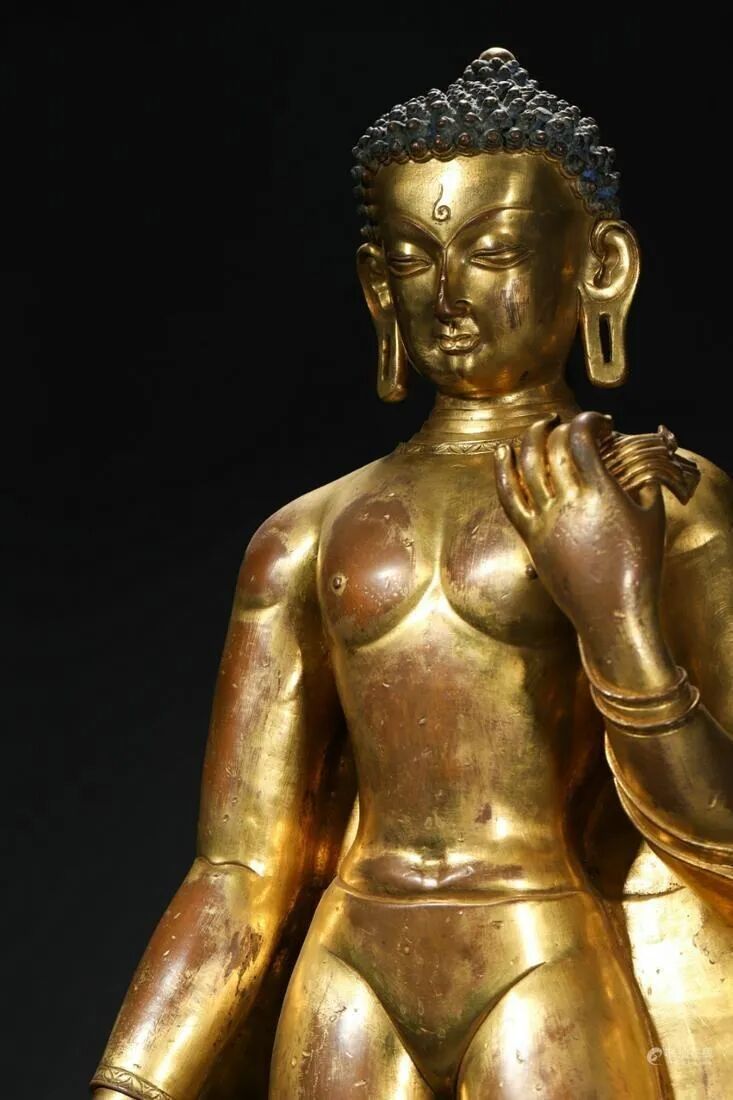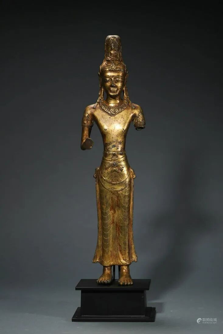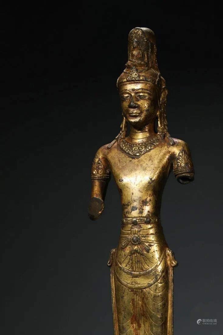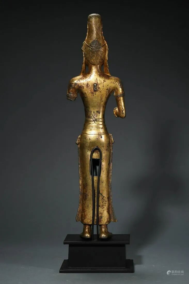 小编对亮眼拍品进行了梳理,如需了解全部拍品,请点击文末“阅读原文”,可浏览完整图录、参与竞拍。联拍在线助您足不出户,尽享全球捡漏之趣!尺寸:佛像 H 47 cm,W 7 cm;总 H 54 cm造像面庞圆润饱满,发丝浓密,呈水波纹式高盘,系丝巾装饰。面容慈悲安详,双目微睁,目光下敛,细眉弯弯,弧度优美雅致,鼻形俊俏,嘴角微扬,表情矜持中而略带笑意。耳饰花铛垂至肩部,颈部铸饰璎珞项链,凸显华贵。腰系锦带,上身坦露,臂膀筋骨凸显显,肩部宽阔,腰部收缩,身形窈窕,气度端庄,华美脱俗。胸腹部肌肉塑造坚实有力,下身着长裙,衣褶轻盈流动,衣纹写实自然,流畅优美。整像造型端庄而精致,制工细腻,雕琢上注重姿态表情及服饰衣纹等细节的刻画,强调线条自身婉转流动的韵律之感,年份特征明显,颇具艺术价值和收藏价值。