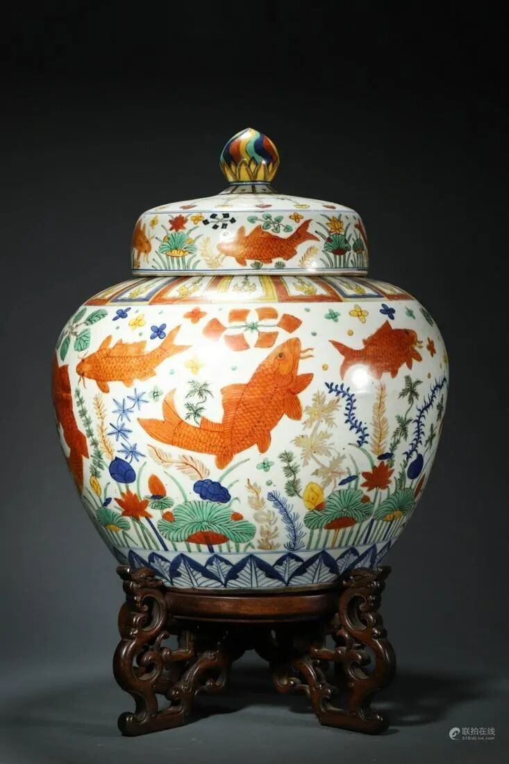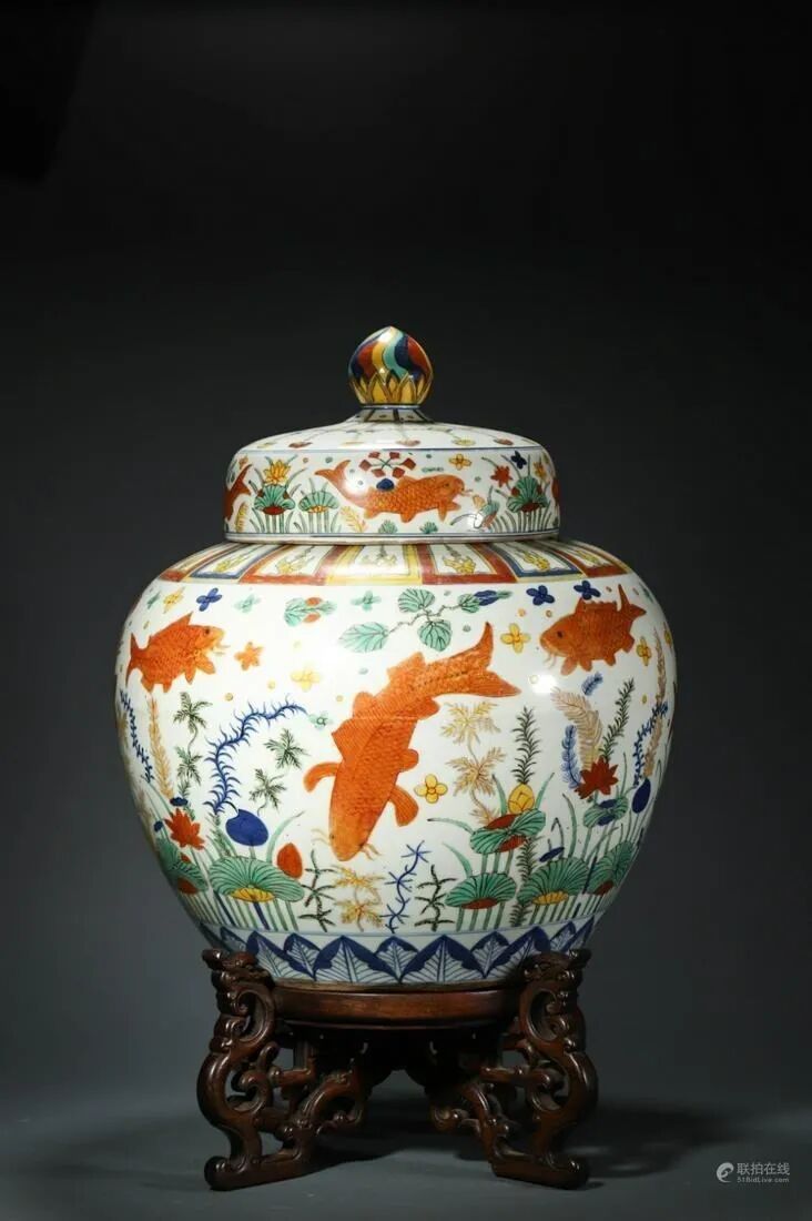 Lot 0010 明嘉靖 五彩鱼藻纹御制盖罐 带原托
