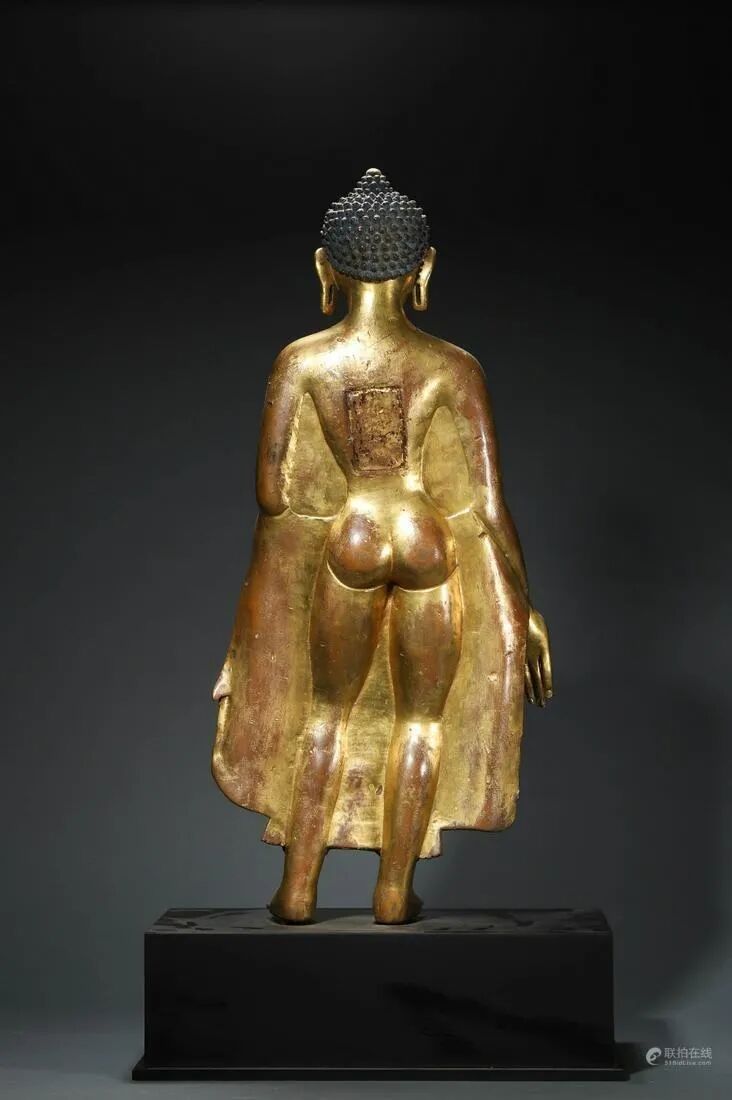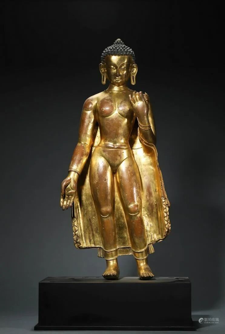 尺寸:佛像 H 56 cm,W 24 cm;总 H 68 cm释尊开脸圆润端正,静谧气敛,似在下沉想冥思。头部铸饰密布的螺旋肉髻,排列整齐,顶宝严珠。五官比例精准,细眉垂目,双唇微启,鼻梁高挺宽阔,大耳肥厚及近垂肩,仪态安详沉静。颈部凸起弦纹三道装饰,其下錾刻精美的花卉纹衬托,袒胸露肚,身披袈裟,衣褶流畅相迭,垂然而下。胸部和肩部铸饰坚实圆润,上躯挺直,肩部宽厚,腰部收敛,形态优美端庄。像身鎏金,光彩熠熠。整体造像铜质精良,胎体厚重,铸造工艺精湛娴熟,造型生动传神,时代特征显著,实为佛造像的精品。