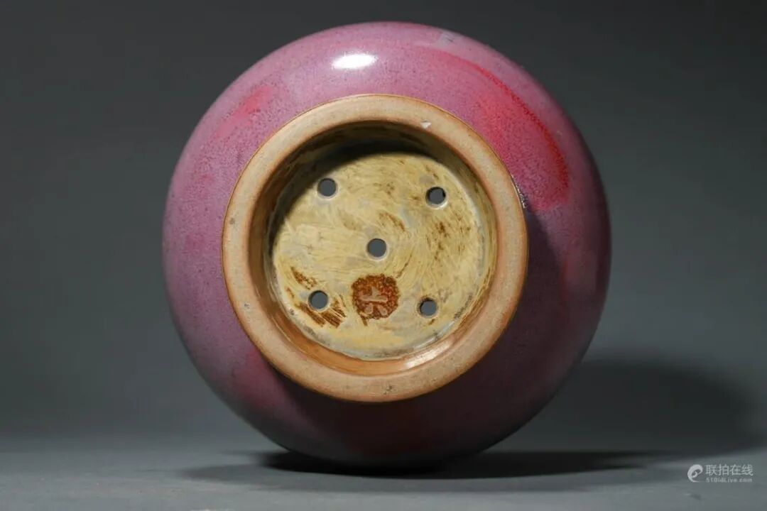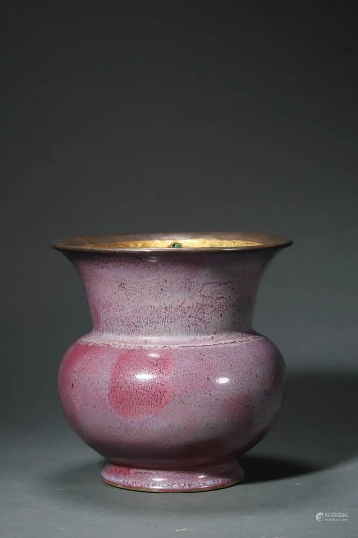 钧瓷始于东汉,兴于宋朝,是宋代五大名窑之一,凭借入窑一色,出窑万彩的神奇窑变居于中国五大名瓷之首,素有黄金有价钧无价的美誉。此件渣斗尊式,敞口外撇,束颈,鼓腹,圈足。胎质细腻坚硬,圈足无釉,折沿上有铜红斑迹,灿若晚霞,古朴自然。口沿处施刀雕刻重阳宫字样,字体工整流畅,笔锋强劲有力。内沿鎏金缠枝花卉纹装饰一周,其上镶嵌各色宝石衬托,凸显华美贵重。外壁满施玫瑰紫釉,釉色肥厚莹润,器身光素无纹,施釉均匀匀净,鬃眼密布,玫瑰紫斑自然晕散,釉色精美雅致,变幻莫测,浑然天成。形制典雅古拙,烧造工艺复杂,成型难度较大,融陈设与实用于一体,极具艺术价值和欣赏价值,尤为难得。