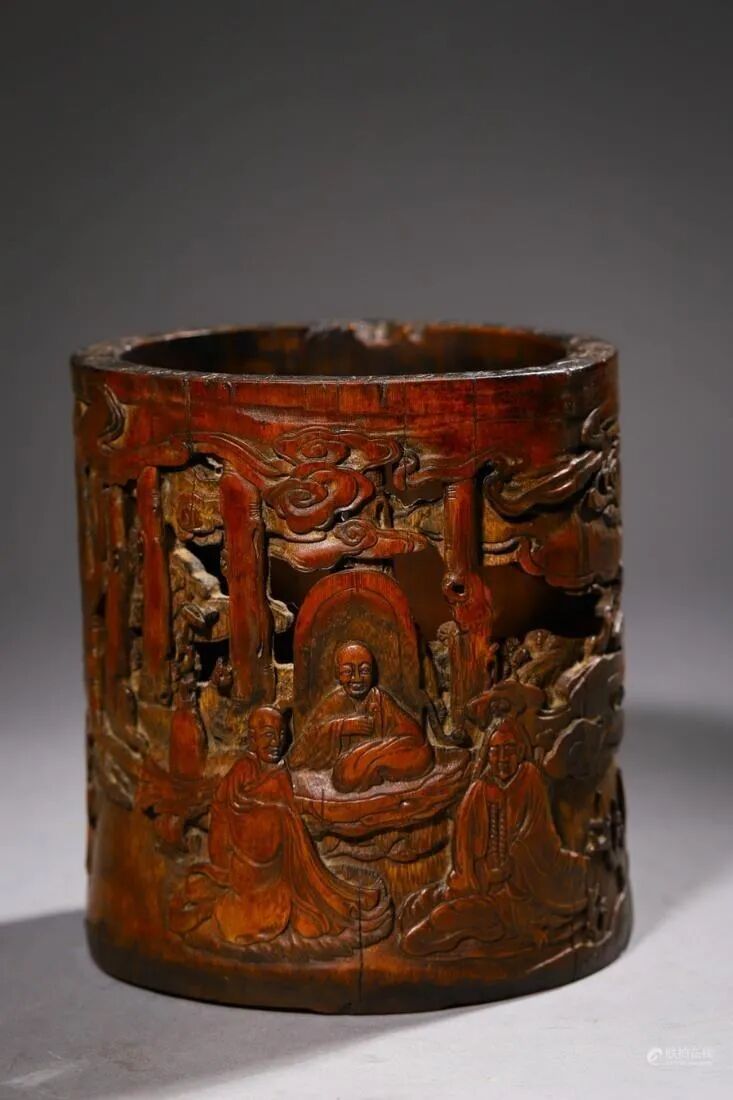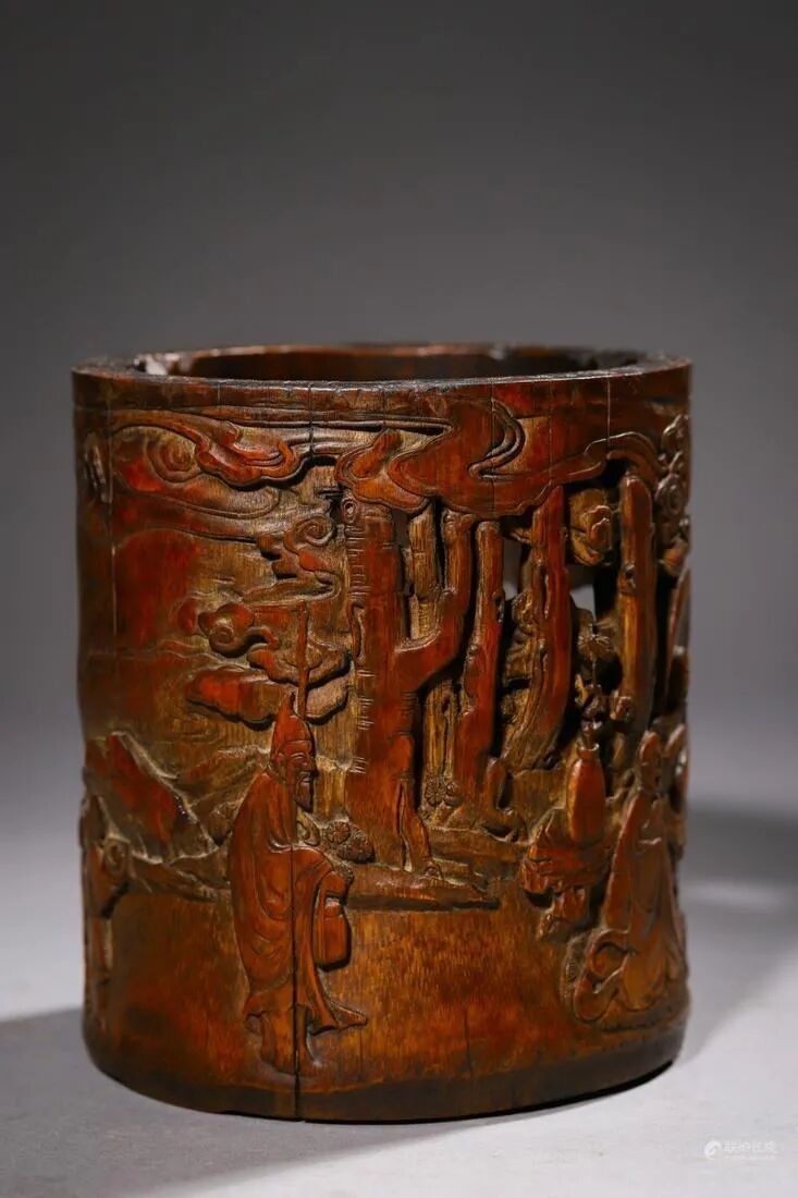 此件笔筒以天然竹茎雕刻制成。圆柱形,直腹,浅圈足,色泽暗红,细洁光润,包浆沉稳明亮。笔筒外壁运用浮雕和镂雕技法呈现出道图画面,人物神情勾勒细腻、生动,刻划活灵活现,精湛绝伦。以阴刻技法所雕剔之山石,似不用稿本,一气呵成,层峦叠嶂,错落有序,周围衬以林木。刀法娴熟轻灵,亭台楼阁,层次清晰,充分表现景致错落之感。画面布局疏密得体,似以刀带笔,颇有文人水墨画作意境,飘逸自然。口沿雕刻一圈铭文。整器在布局能力,雕刻技巧和文化内涵层面都属于杰出的竹刻作品。