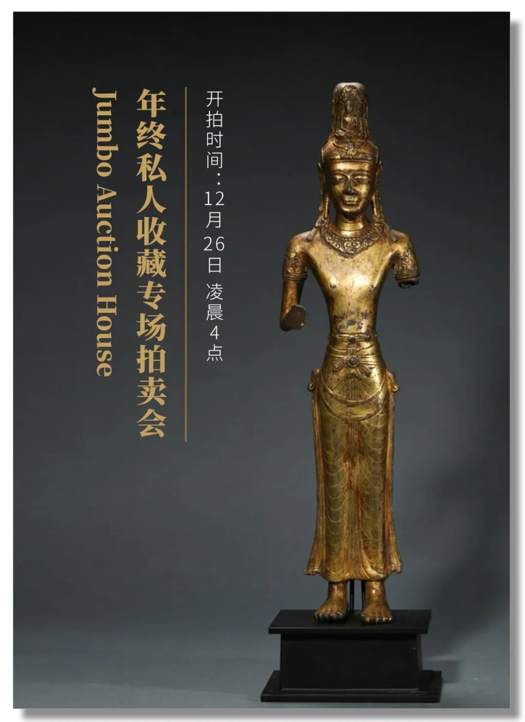 Jumbo Auction House(臻宝拍卖)位于美国加利福尼亚州圣盖博,这里是著名的华裔聚集区,因此常有私人珍藏亚洲艺术精品现身当地拍卖行。作为一所家族拍卖行,Jumbo 数十年来一直致力于搜寻符合艺术爱好者和专业藏家审美意趣的特色艺术品。北京时间12月26日,JumboAuction『年终私人收藏专场拍卖会』将在圣盖博正式开启,联拍在线将全程直播,并提供实时同步竞拍技术和服务支持。本次共有617件精美标的上拍,涵盖宗教艺术、瓷器、玉器、鼻烟壶、文房等门类。大部分拍品的起拍价格在数百美元的区间内,十分接地气,是云淘捡漏的好时机。