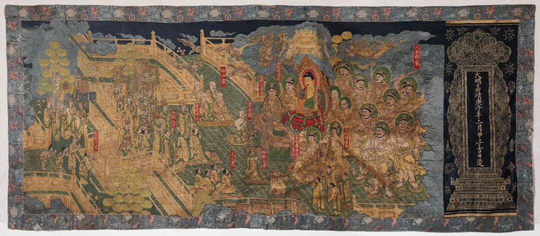 本幅唐卡绘制细腻,构图精巧,勾线有力,形象表情精准,描摹生动,设色协调。无论是释尊,还是诸佛,身形、神态均绘制精到,自然生动,栩栩如生。就艺术风格而言,本品呈现出典型的嘉靖宫廷画派风格。画面布局繁复,疏密有致,层次清晰明确。画面设色艳丽,色彩对比鲜明,华丽绚烂,且耀眼夺目。唐卡的绘制对画师具有较高的要求,需沐浴净身,颜料需特别处理,整个绘制过程中,需契合戒定慧三学,严格遵照仪规,不可随意发挥,足见唐卡绘制的难度。本幅唐卡虽历经长远岁月但保存状况良好,金彩书大明嘉靖庚子年二月甲子吉日造明确纪年款识,裱工同样彰显宫廷气韵。