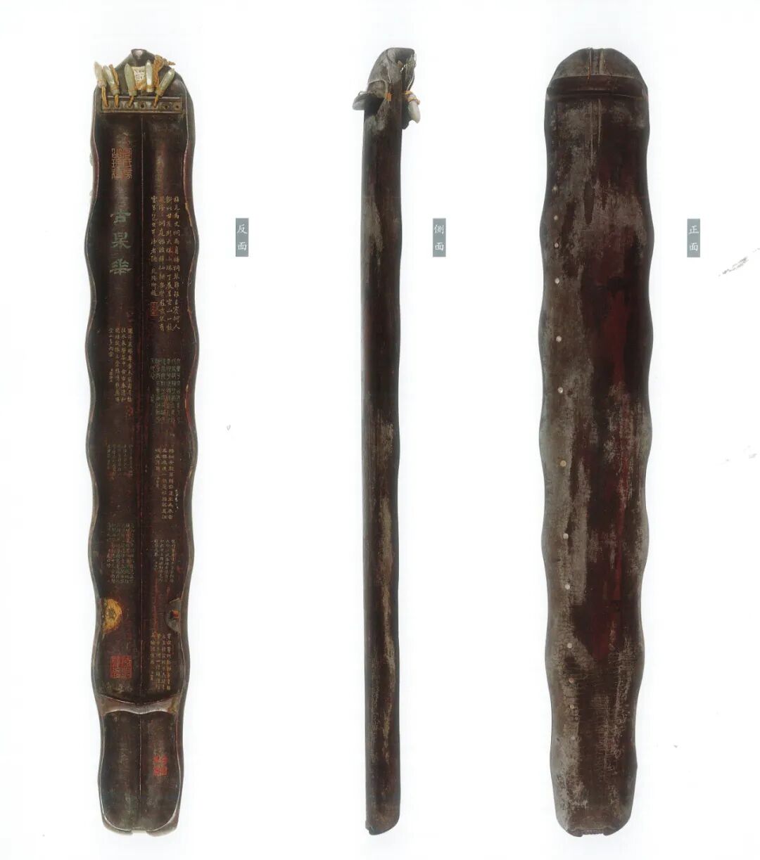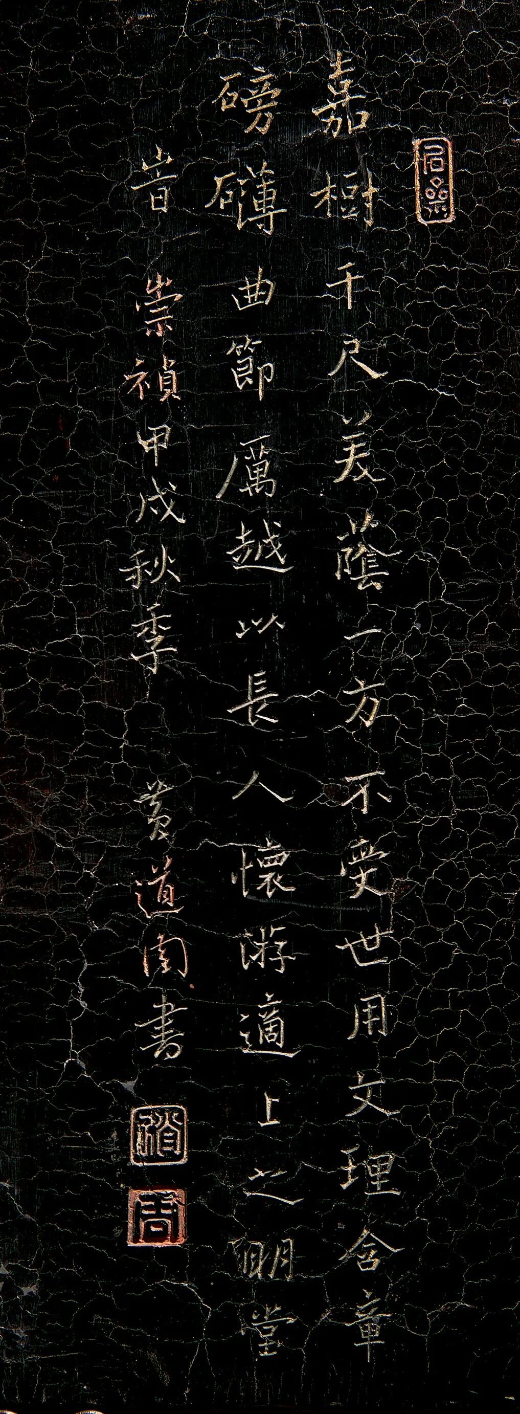 崇祯七年甲戌(1634)秋季,晚明书法大家、学者、忠臣黄道周为一把宋代古琴写下这八句三十二字铭文镌刻于琴身。此琴仲尼式,桐木斫,素髹黑漆,螺钿徽,通体梅花断;琴体轮廓线条比例秀美匀称,在劲挺利落中不失弧面曲线的圆润,有着宋代古琴特有的硬朗之风。![]()