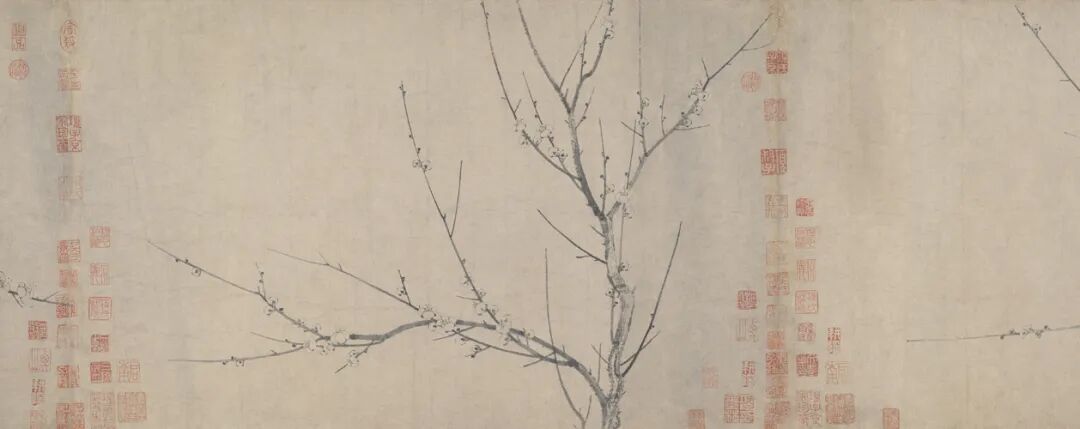 古人推崇梅花断纹的另一个原因是梅花意象在文学作品中不断得到确立,在绘画作品中也不断有经典之作问世,从林和靖《山园小梅》中“疏影横斜水清浅,暗香浮动月黄昏”,到苏东坡《十一月二十六日松风亭下梅花盛开再用前韵》中“罗浮山下梅花村,玉雪为骨冰为魂”,字句中梅花素艳寒香,不媚世俗;绘画中有以扬无咎为魁首的“江西梅派”,从扬无咎的《四梅图卷》和《雪梅图卷》,到徐禹功《雪中梅竹图》,吴镇《墨梅图》等,文学和绘画最终都对焦对梅花众芳摇落独暄妍傲骨不屈精神品格的追求。宋扬无咎《四梅花图》卷(局部)