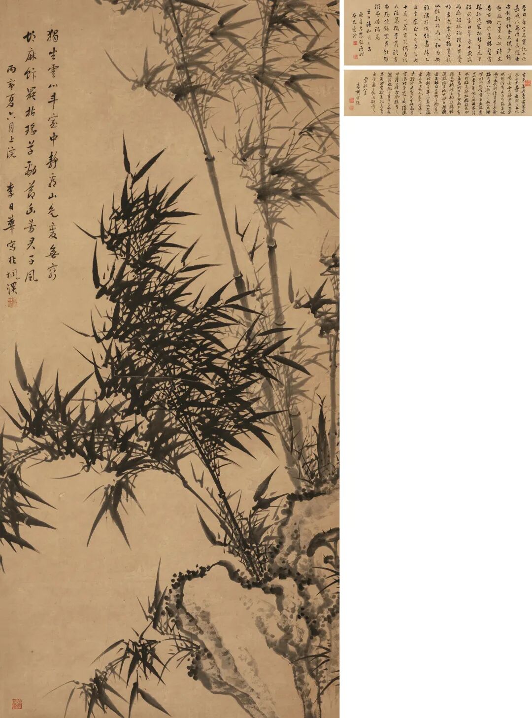 2.古来善丹青者甚众,而善于画竹者寥寥。五代以前竟无可称述。迢及宋代,则僧有文与可、苏东坡;而至元代,则僧有李息斋、梅花道人、顾定之、柯九思诸贤;明代则僧有王孟端、夏昶、李日华、倪元璐诸家;清代则独有郑板桥称最而已。盖画竹下笔即成,不容添改而妍媸立辨,非襟怀洒脱、胸有成竹、心手相应者不能及,画竹之妙是以。历时数千年,以画竹见称者,不过十余人....因题识之。丙午秋八月,士谦刘寅题。钤印:刘寅、士谦、石壶道人。