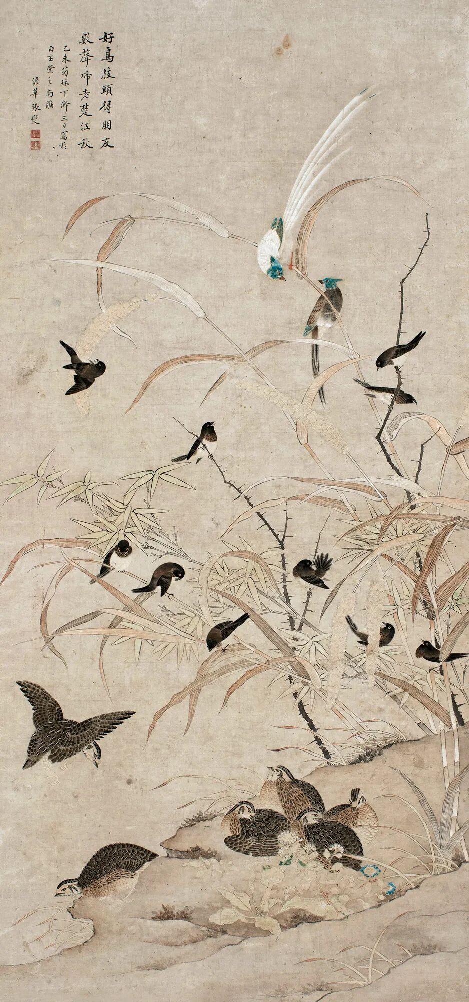 题识:好鸟枝头得朋友,数声啼老楚江秋。己未菊秋下澣三日,写于白玉堂南窗,澹华张燮。