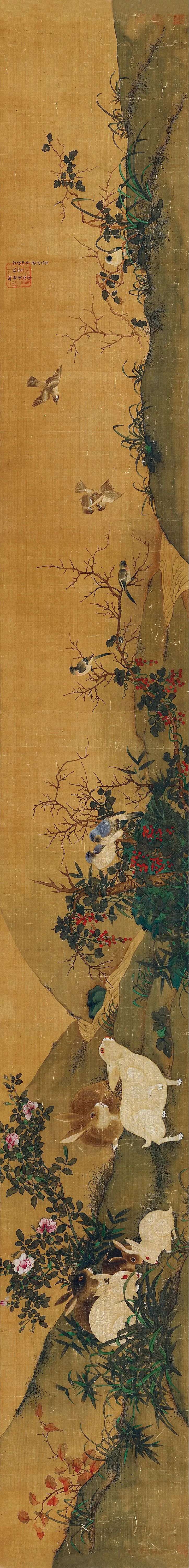 1.御笔亲摹玉兔奇画,师虽巧亦难齐中原麟凤知多少未得君王一品题。隆庆改元仲秋,琅琊王世懋。钤印:王氏敬美、妙明山房