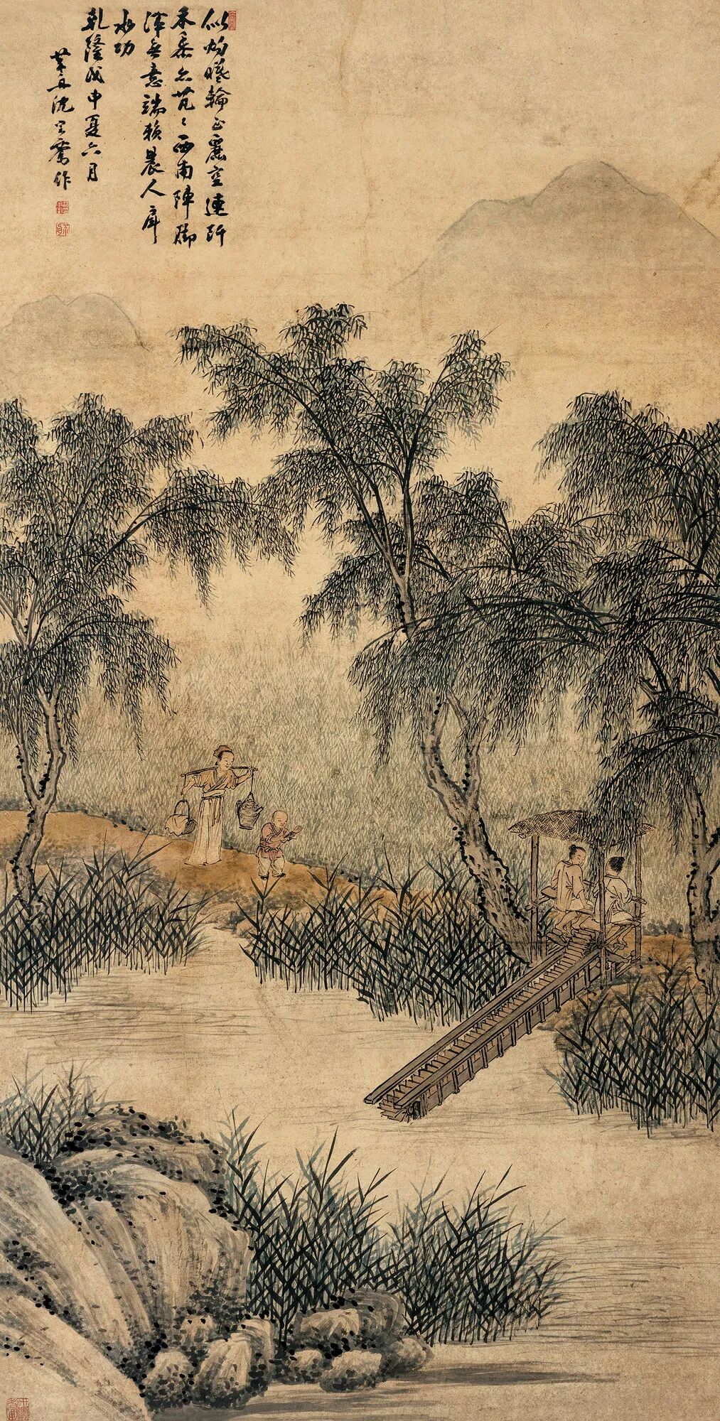 题识:似灼曦轮正丽空,连阡禾黍亦芃芃。西南阵脚浑无意,端赖晨人戽水功。乾隆戊申夏六月,芥舟沈宗骞作。