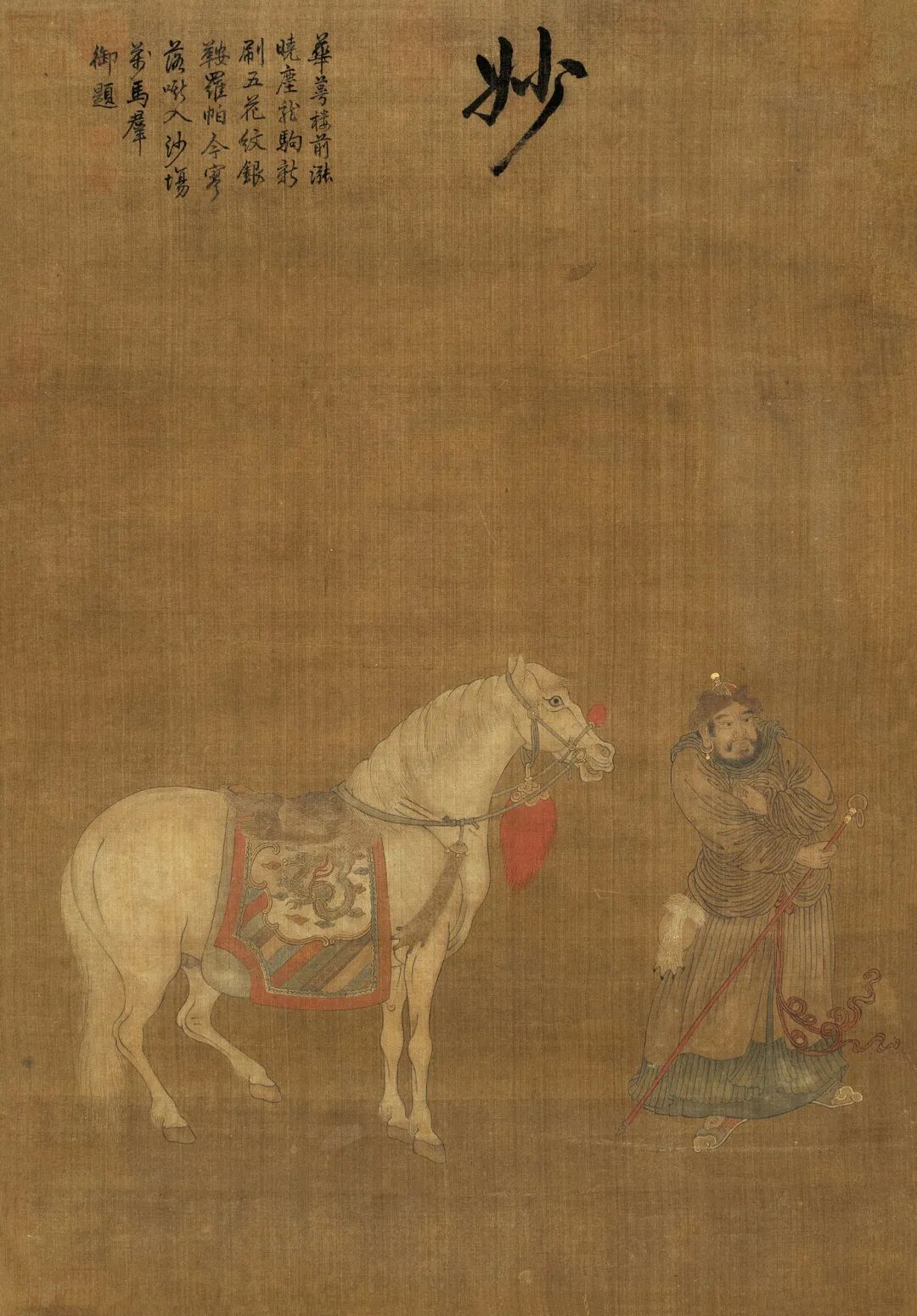题跋:花蕚楼前涨晓尘,龙驹新刷五花纹。银鞍罗帕今廖落,啭入沙场万马群。御题。