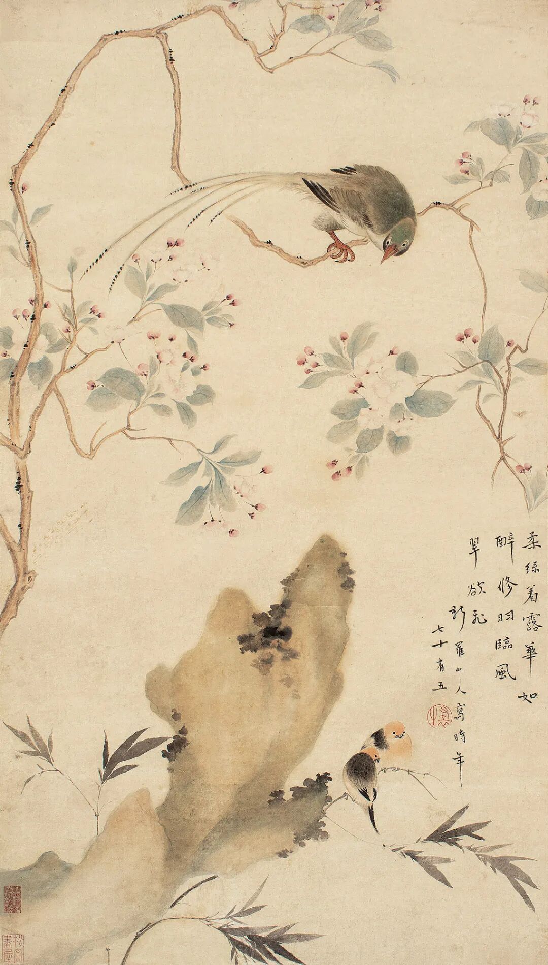 题识:柔丝着露华如醉,修羽临风翠欲飞。新罗山人写,时年七十有五。
