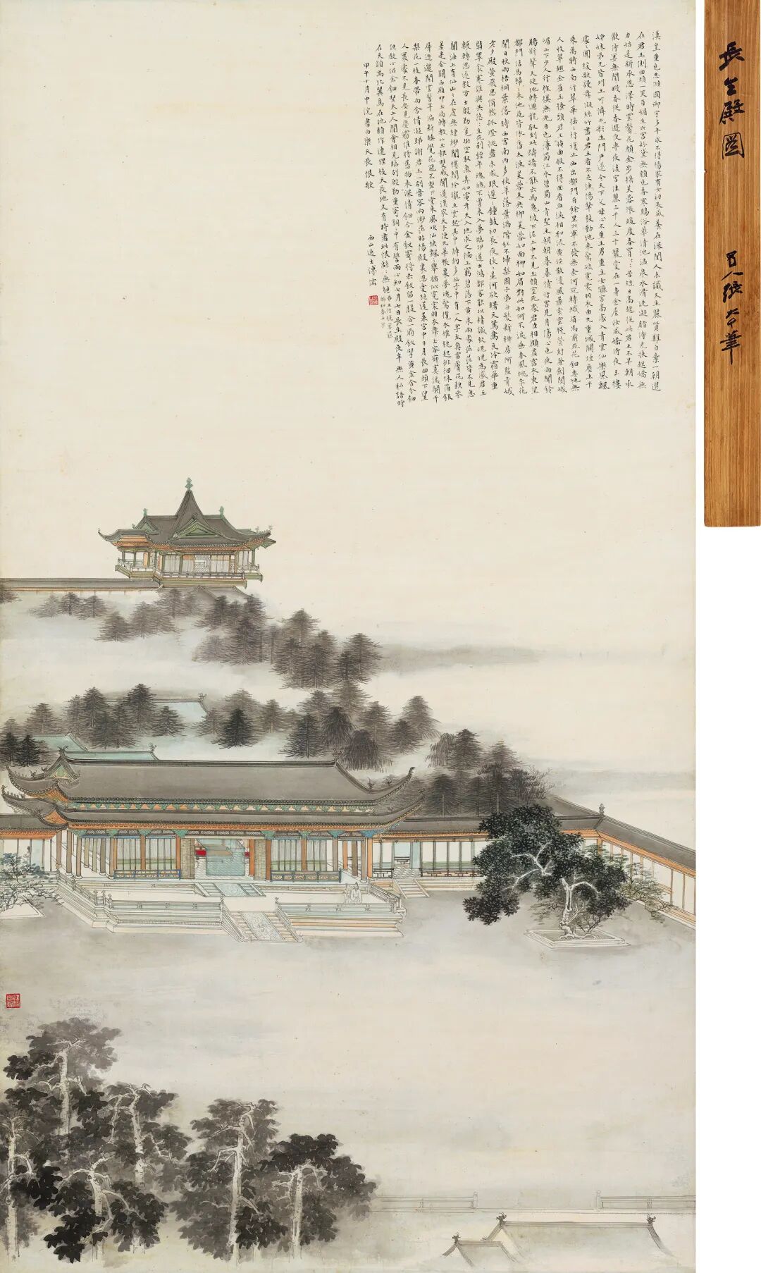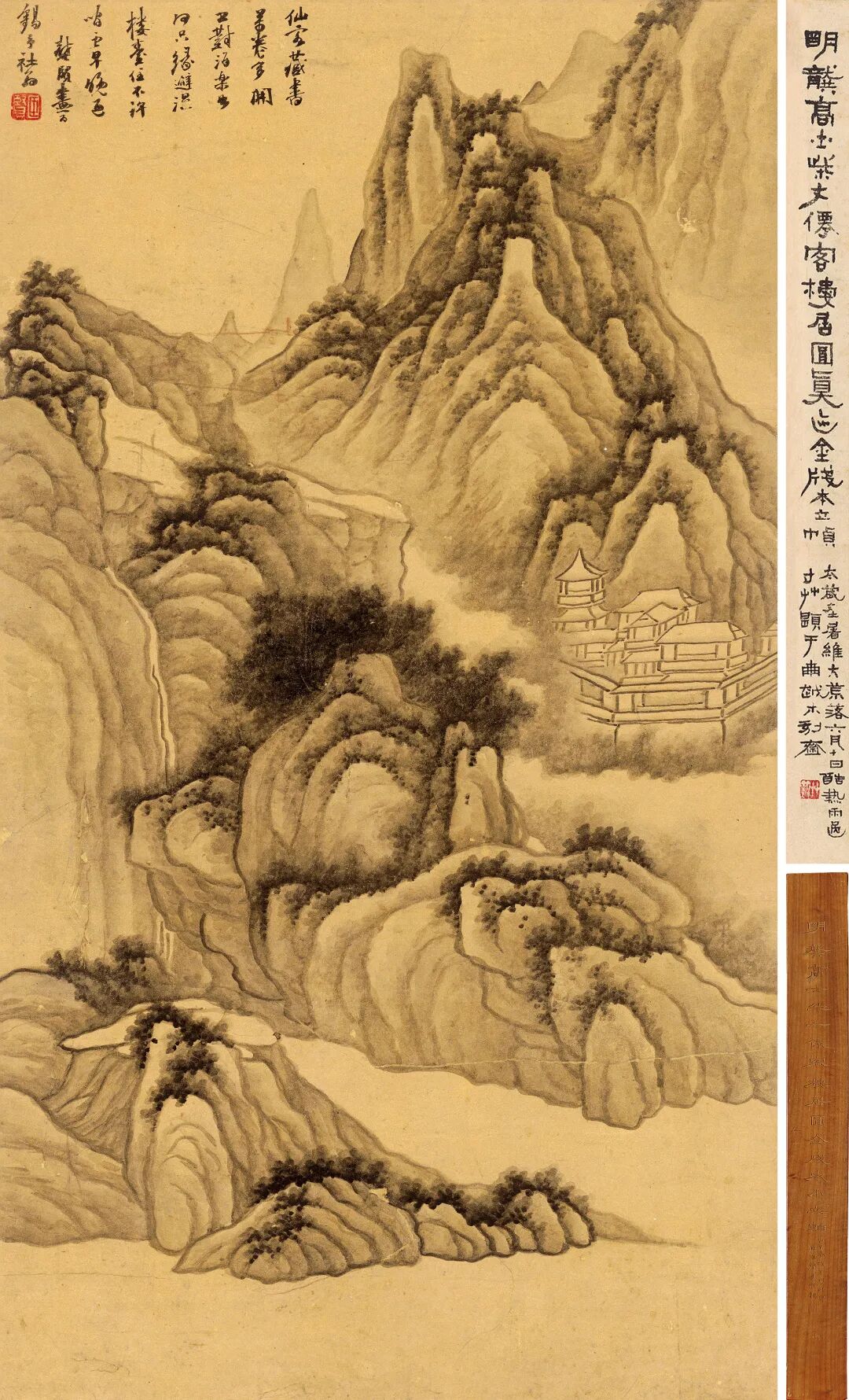 签盒:明龚高士半千《仙客楼居图》金笺本小立轴。己巳春海王村所得,南海关寸草题。钤印:关