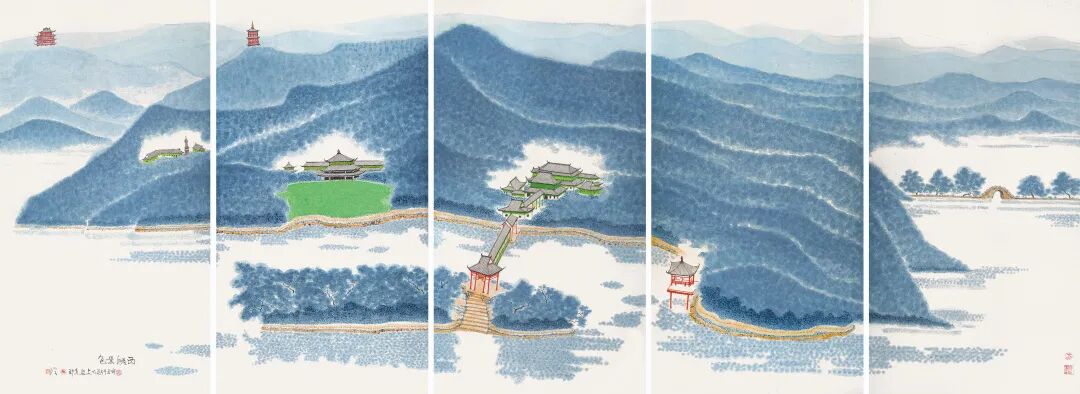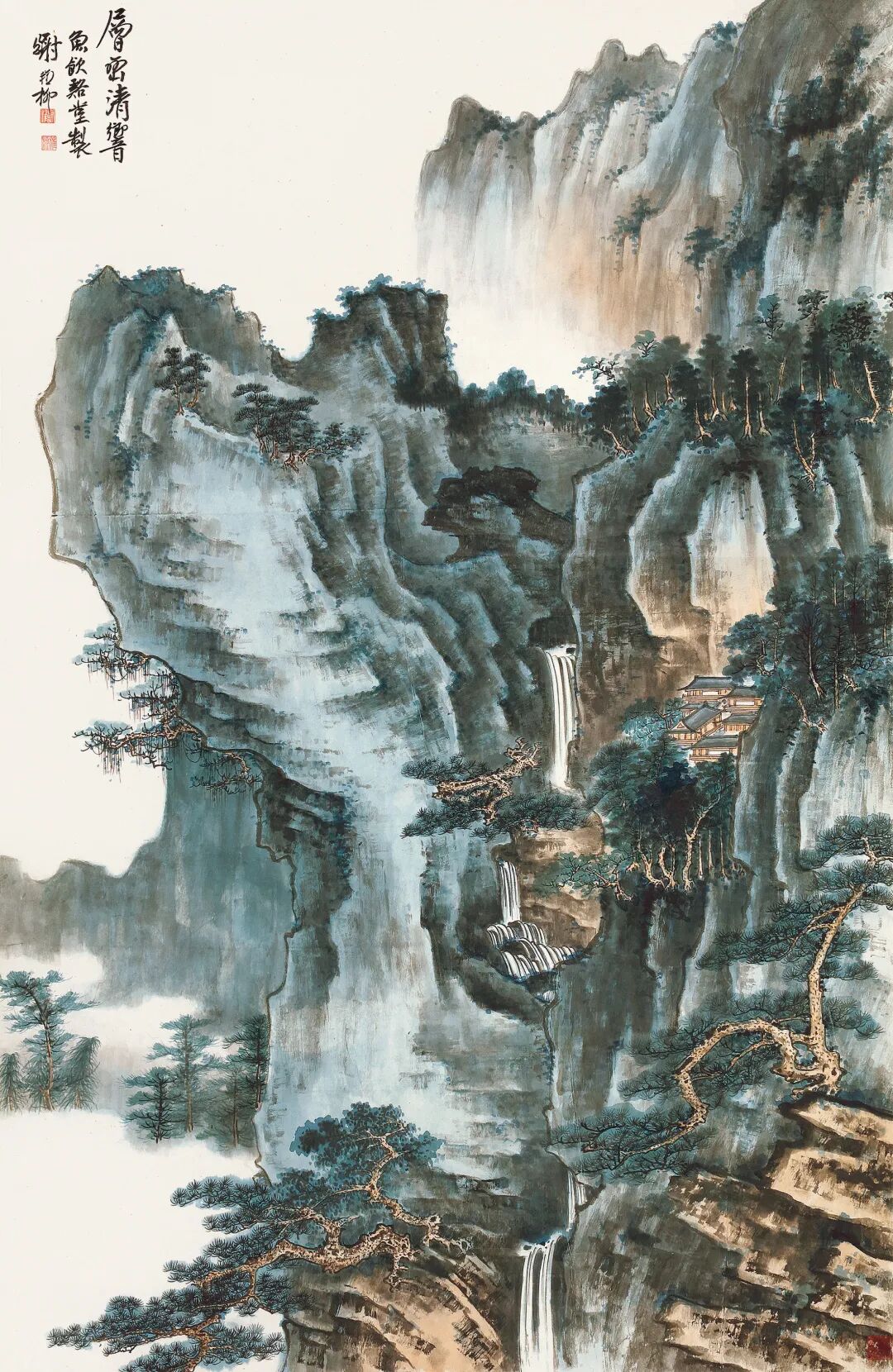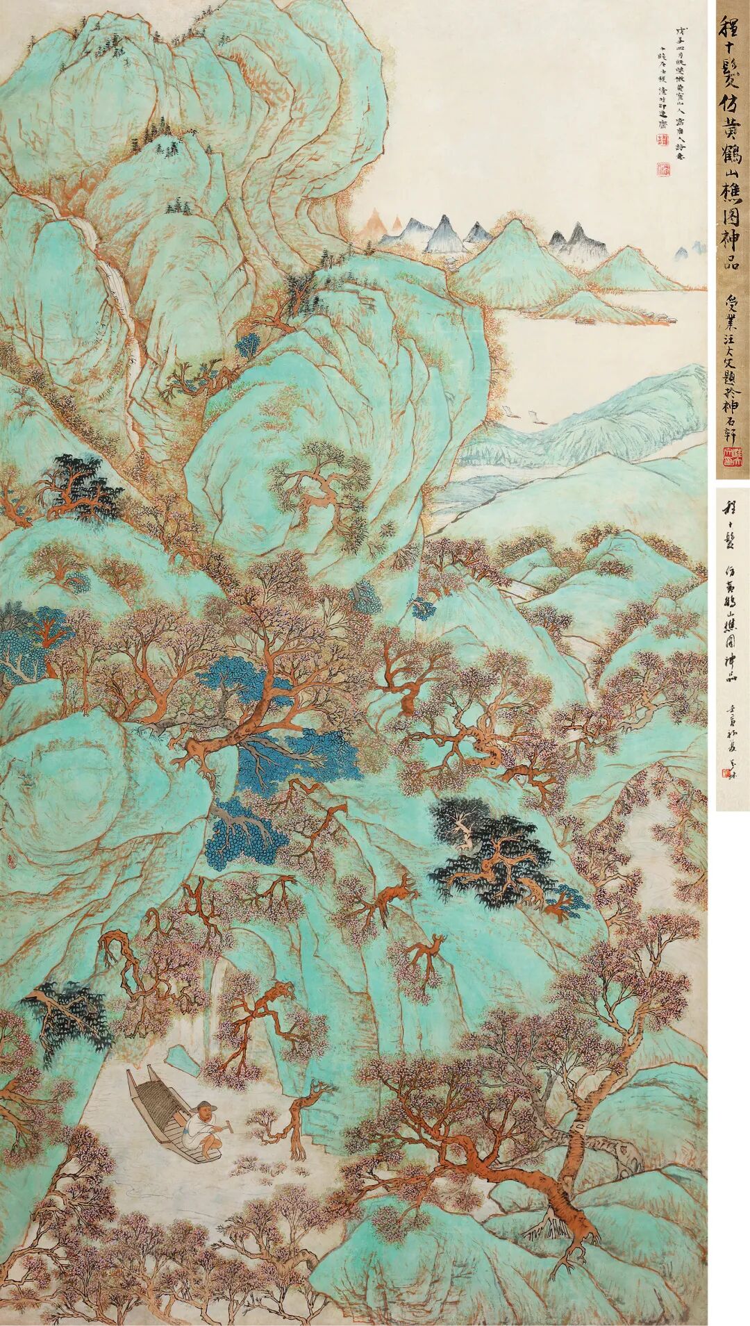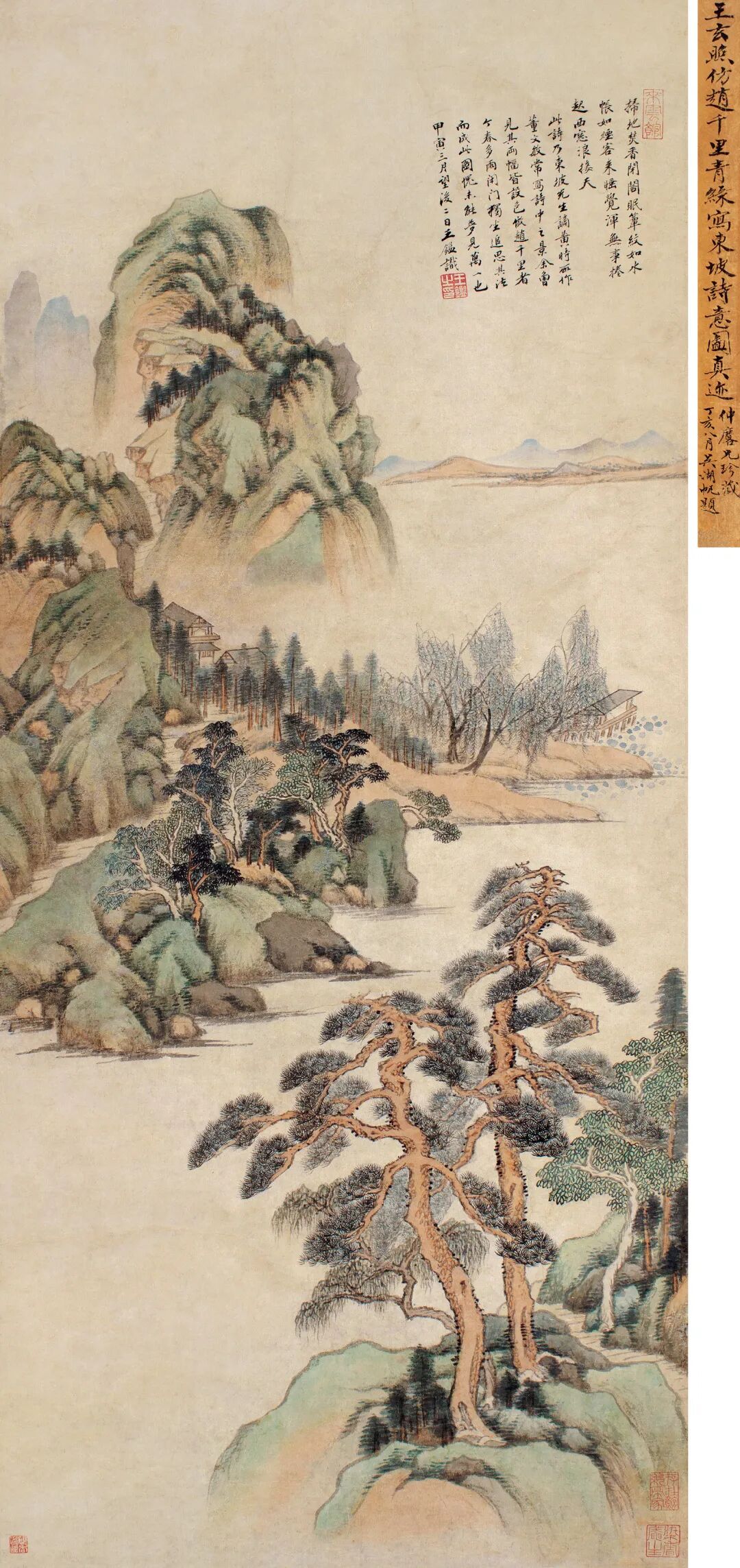 题签:王玄照仿赵千里青绿写东坡诗意图真迹。仲麟兄珍藏,丁亥八月,吴湖帆题。
