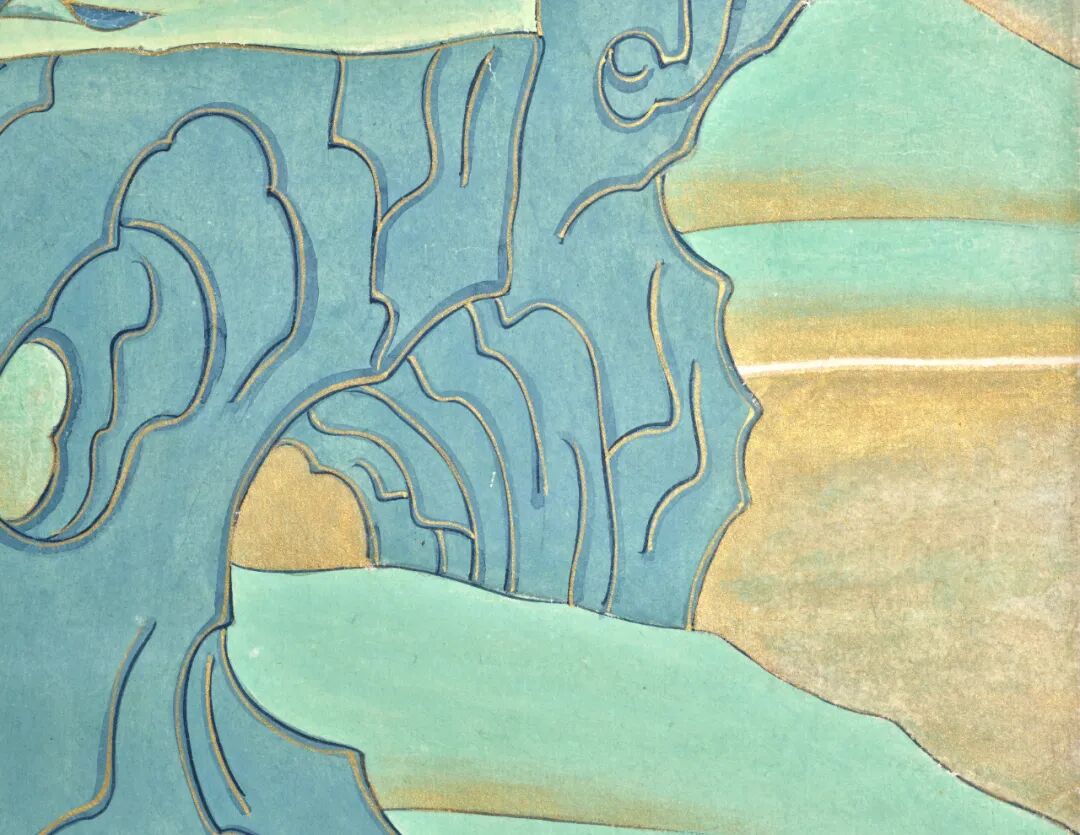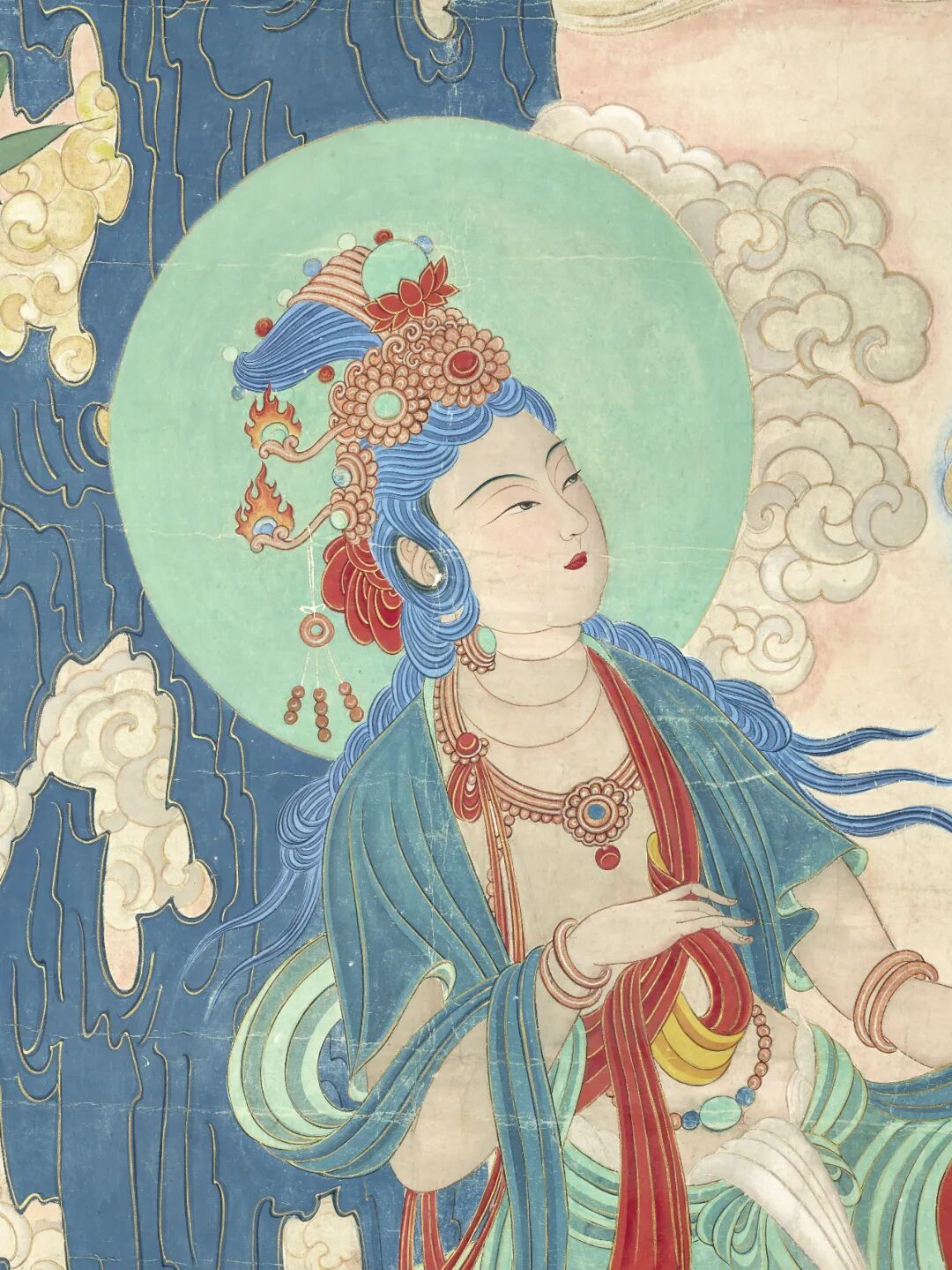 相较于其他三个版本的《水月观音》,本幅在菩萨面部的塑造上,大千揉参己意,尤能揣测其风格走向。观音开脸丰腴饱满,眉毛弯曲,黛色钩勒眉形后又以石青晕染,神采愈增。鼻梁挺秀,小口肥唇,眼神柔和,于庄严慈悲中,暗藏凡间女性之可亲仪态,十分动人。敦煌石窟,上下千年,壁中无数美人,无论是近事女、供养人、国夫人、贵族后妃,多半是丰腴的、健美的、高大的,这形形色色的面孔启发了张大千,盛唐之风照拂下的“以肥为美”也可以惊艳世人。