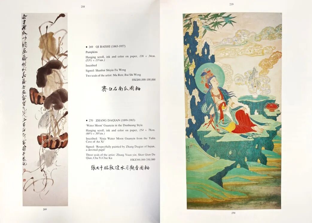 五十年代以后,大千鲜少再以工笔完整对临敦煌作品,惟将所存旧稿,“时画时缀”、“间复点染”,而“鬓发兜鉾,未及钩染处,即命二生完成之。盖予目翳八年,不复耐次细笔矣”。大千去国后,留川家属将早年大千自敦煌带回稿件,悉数捐赠,存于公家收藏。而本幅《水月观音》,历经战火,仍能保存完好,流传于世,如今飘扬过海,再现香港拍场,冥冥之中,自有佛力护佑。