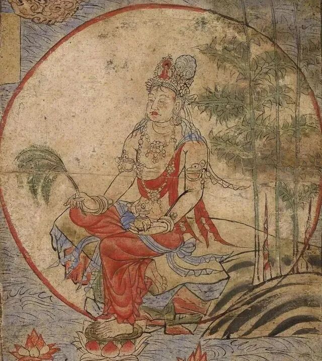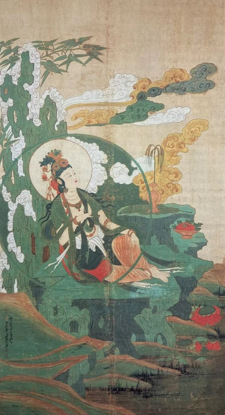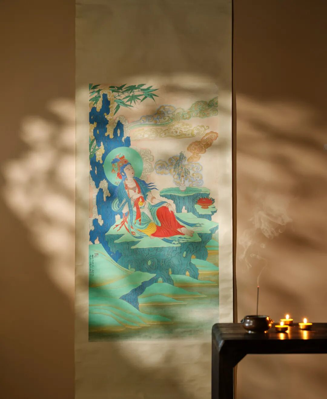 本幅工笔描金重彩,作于纸上,上世纪八、九十年代现身拍场后,睽违近三十年,方再释出,乃目前仅知张大千传世四幅临榆林窟西夏“水月观音”之一。