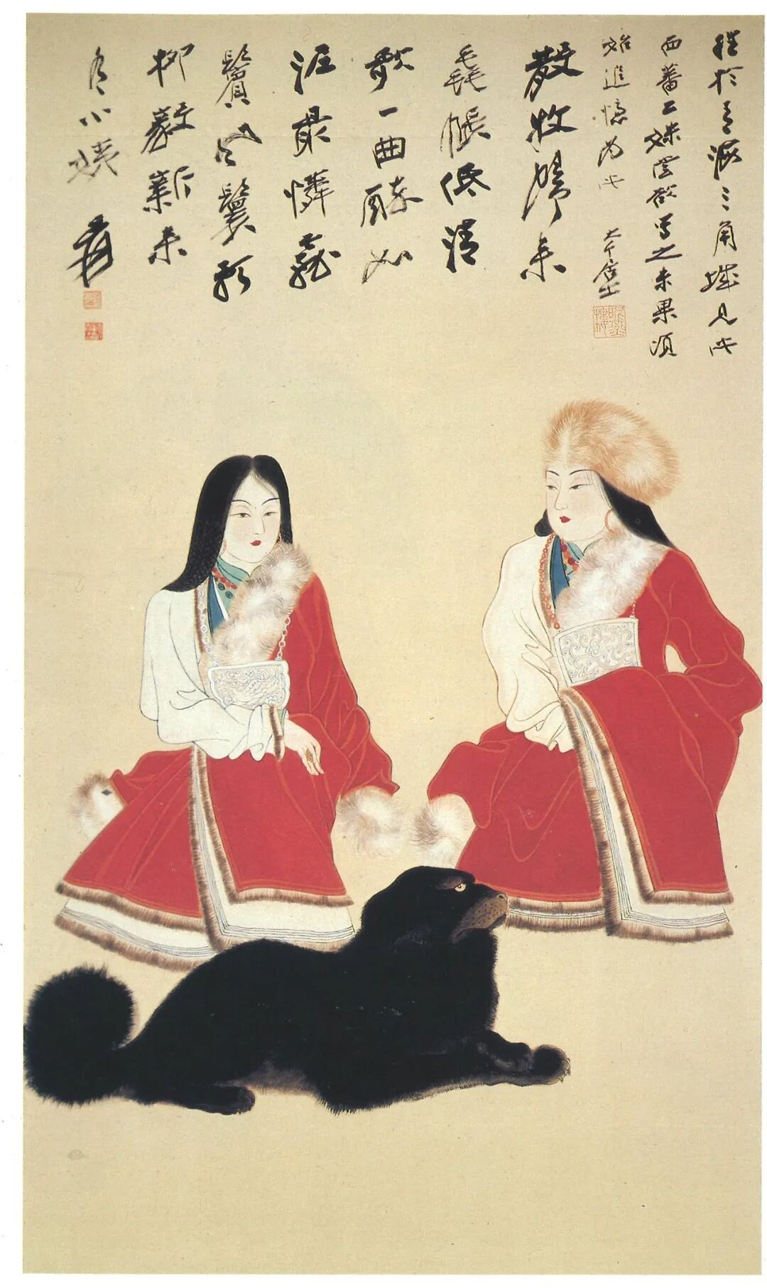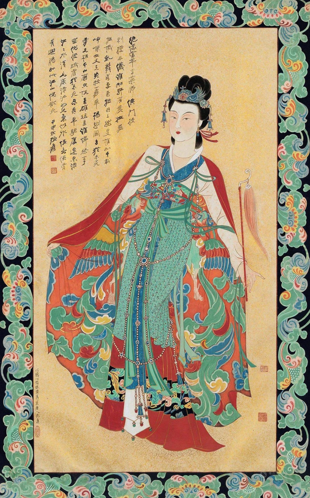 “千堵丹青,遁光莫曜.....上自元魏,下迄西夏,绵历千祀,杰构纷如,实六法之神皋,先民之矩矱”,敦煌之行对大千影响深远,他的性情、阅历都因此而进入新的阶段。画风丕变,尤其是人物仕女画创作,一改早年清新淡逸,娟秀纤弱,转而走向雍容华贵、大气奔放。