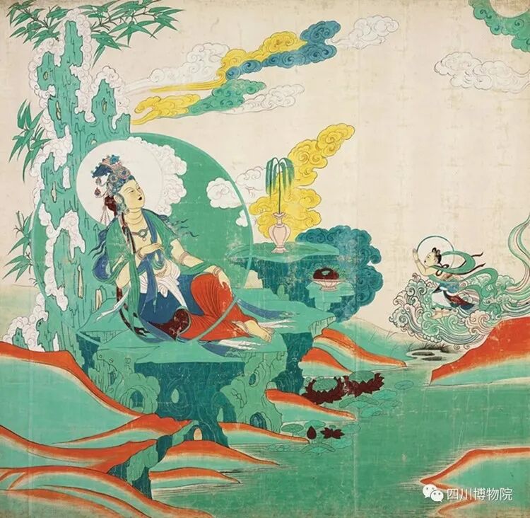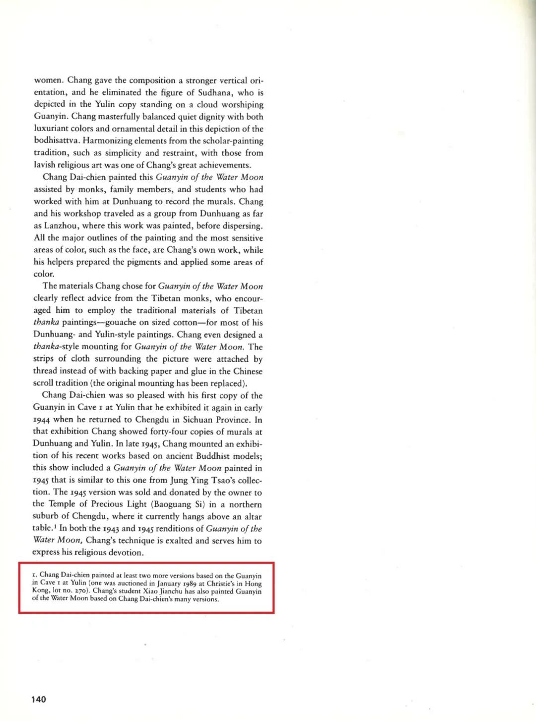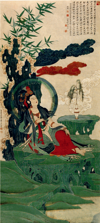 一九四五年,四川成都举行的“张大千画展”,展出第三本《水月观音》。与前两版不同,本幅作于纸上。一经问世,便引起轰动,达官显贵争相购买。最后,作品由新都县“邦人仕女”集资买下,捐入宝光寺。该幅构图与默斋本相似,但在净瓶、圆光、云雾、山石等细节处理上做出改动,使作品更为简化。