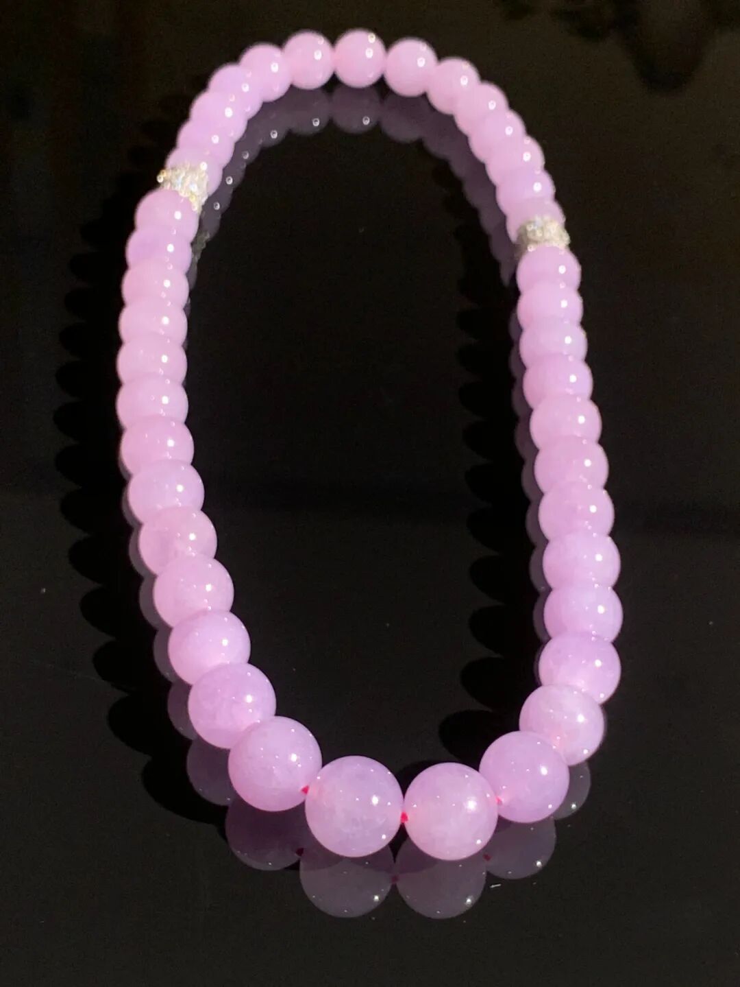 由41颗紫色翡翠珠串组成,每颗都具有浓郁的紫罗兰色泽和极透光种质,最大直径为15.5至最小12.8毫米,并以两个镶钻石的球形珠扣作点缀。