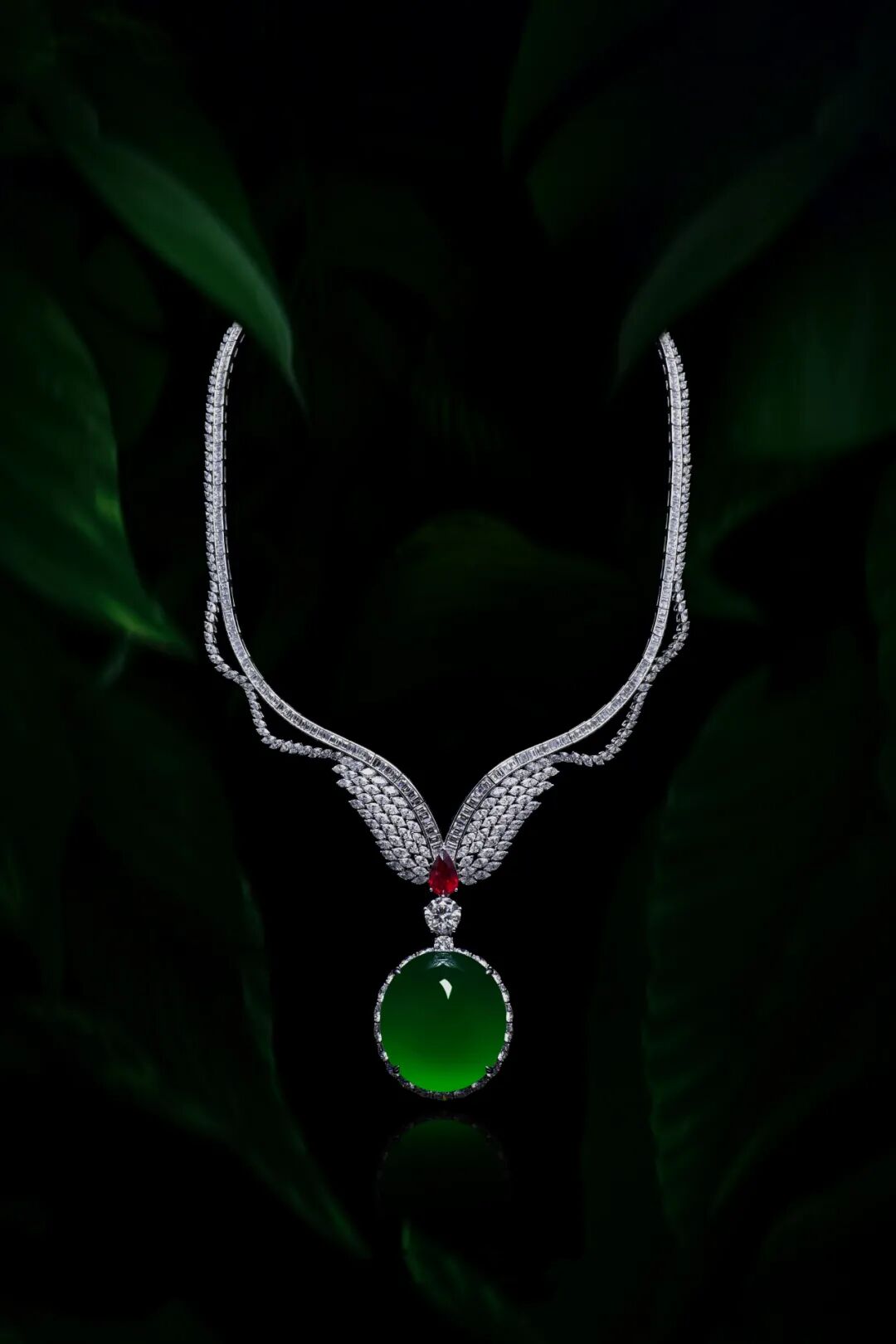 项链长度约40.0厘米玉润玲珑剔透,浓“帝皇绿”色的蛋面翡翠极为罕有,悬挂于圆形明亮式切割钻石和梨形红宝石项链下,项链呈羽翼状,镶以梯形和榄尖形切割钻石。