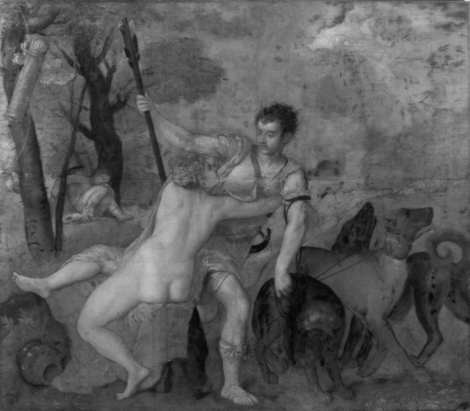 提香从 1520 年代开始通过一些作品探索奥维德《变形记》中描述的故事,由此启发的创作成果「诗画」最终构成了他的巅峰艺术成就。这当中包括《维纳斯和阿多尼斯》这描绘恋人告别的永恒主题,成为提香最重要的神话主题之一。