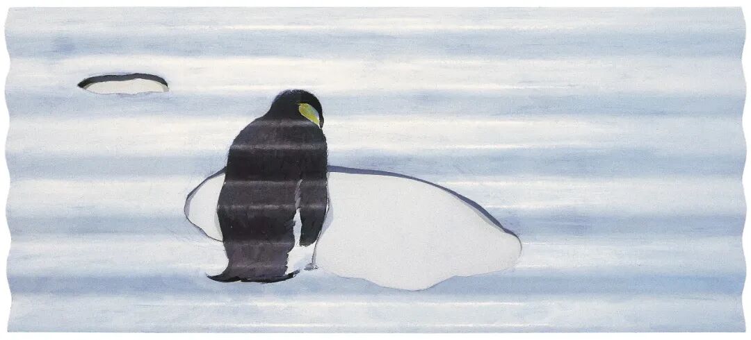 王兴伟因今年在上海当代艺术博物馆的个展“王兴伟在上海2002-2008”而广受关注,《无题(企鹅和洞)》亦在该展中亮相。本作以艺术家标志性的企鹅意象为主题,瓦楞板自身质地与画作中的冰面合而为一,板上两处挖空亦为画中两个冰洞,艺术家的狡黠与幽默显露无遗。