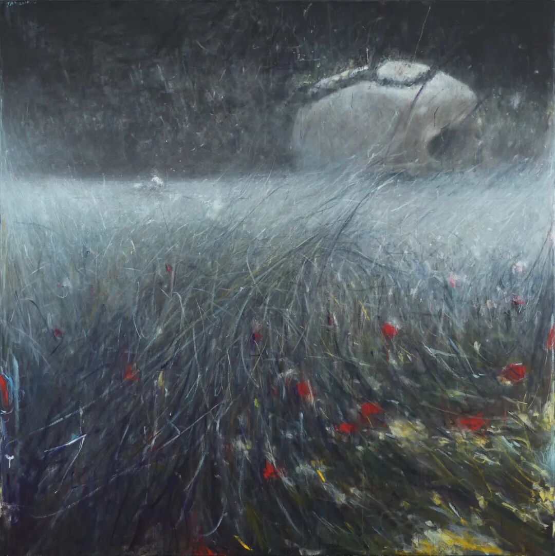 另一幅作于2010年的《无题》看似描绘风雨交加之景,实则却暗藏玄机——艺术家在画背题写苏轼《定风波》全篇, “莫听穿林打叶声,何妨吟啸且徐行。” 一句点明艺术家超脱尘世,处变不惊的豁达心境。