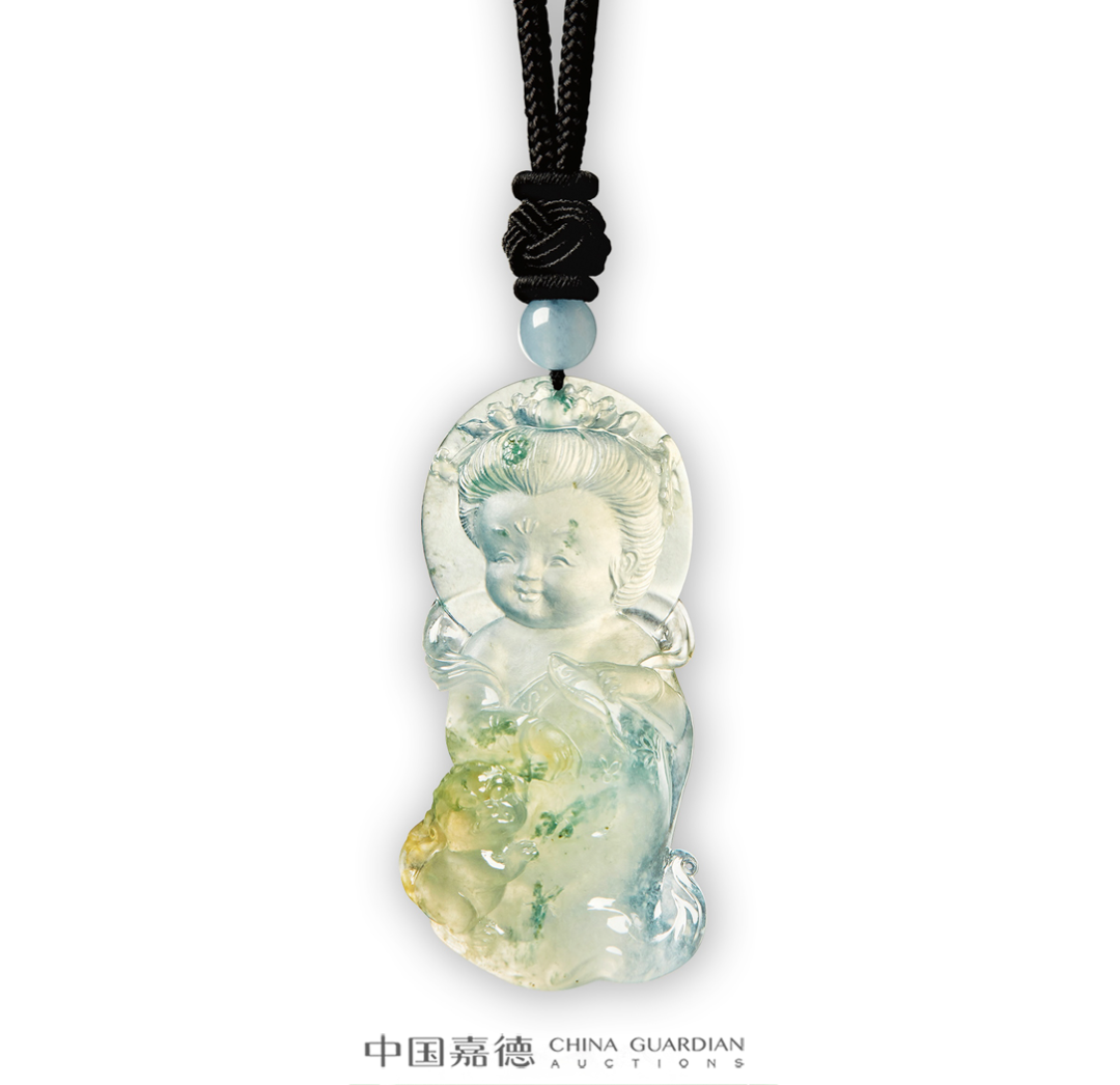 Lot 4842翡翠挂坠出自玉雕名家之手。以传统「如意」为题材,如意与祥云盘绕,精巧小蝙蝠伏于一侧,流畅的雕刻线条使整块材料仿佛「活」起来般气息流转。
