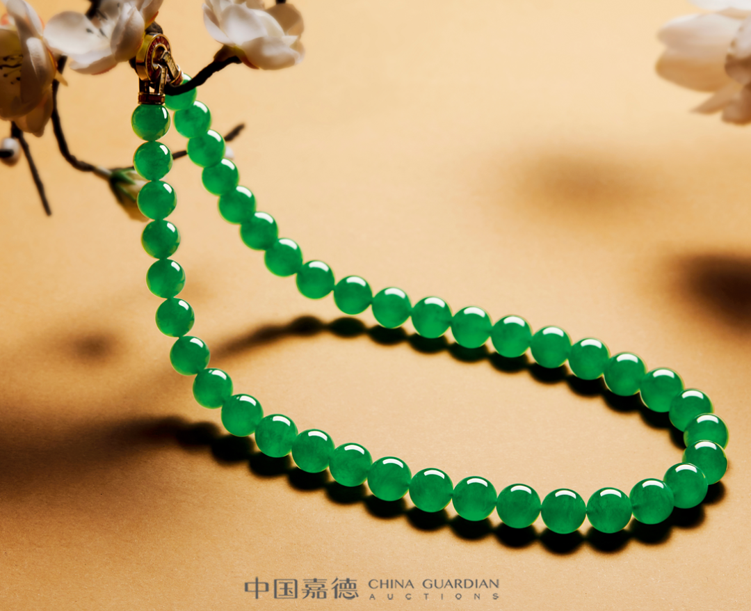 本季拍卖Lot 4818翡翠珠链,其独特的气韵令人眼前一亮,爱不释手 。