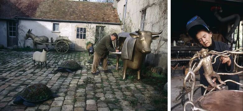 左图:弗朗索瓦-格扎维埃拉兰内在乌里制作一尊金属公牛雕塑。照片: Micheline Pelletier/Sygma/Getty Images。艺术品 2022 Artists Rights Society (ARS), New York / ADAGP, Paris。右图:克劳德拉兰内在乌里的工作室内创作。图片: Micheline Pelletier/Sygma/Getty Images。艺术品 2022 Artists Rights Society (ARS), New York / ADAGP, Paris