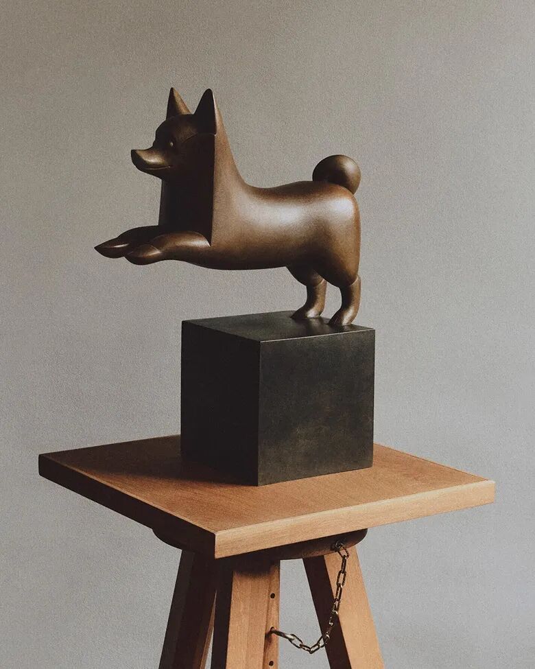 弗朗索瓦-格扎维埃把四周的事物化为抽象,通过雕塑重塑物件的形态,而克劳德则把身边的材料提炼成艺术杰作。她利用电镀技术,把取材自花园内实物的作品浸泡在硫酸和硫酸铜内,在表面镀上薄薄的一层铜,再用双手把物件雕琢成珠宝、雕塑或家具。在《鸡脚卷心菜》(Très Grand Choupatte,2014年作)里,克劳德以青铜结合花园里的动植物,把一颗卷心菜作为头部,配上一双鸡爪,这种杂交的方法强调了我们对大自然坚信不疑的认知。作为克劳德最知名的作品之一,《鸡脚卷心菜》体现其怪诞的幽默感和独特的世界观。弗朗索瓦-格扎维埃·拉兰内(1927-2008) 《小英雄犬II(小狼)》,2002年作,棕锈青铜,42.2 x 33.3 x 15.6 cm.,估价:100,000 - 150,000 美元。此拍品将于12月7日佳士得纽约“雕塑天堂:玛丽·拉兰内珍藏拍卖”中呈献