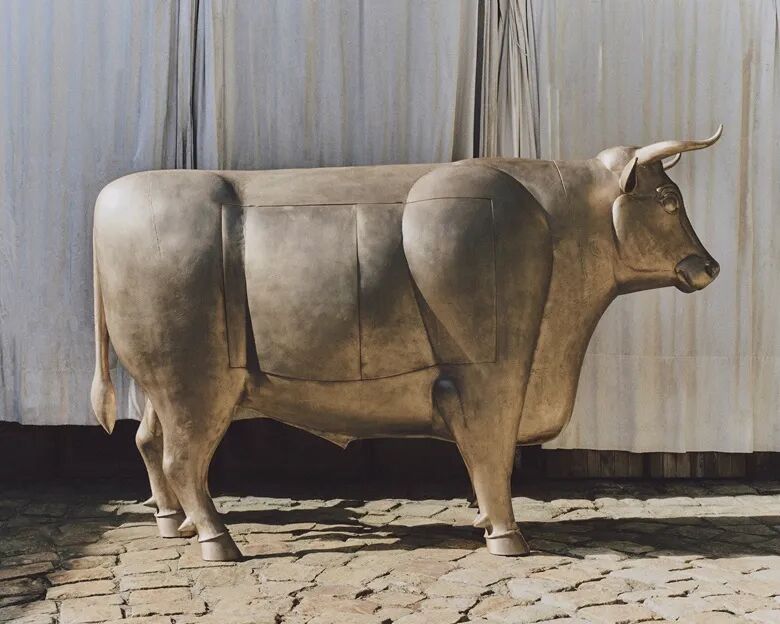 克劳德坚持每天在工作室外工作,维持规律的生活作息,并有家人、朋友和助手陪伴在侧,直至2019年离世。在她的手里,乌里的植物成为作品的参考原型。《蝴蝶吊灯》(Lanterne Papillons,2018年作)以飞舞的蝴蝶点缀扭曲的树枝。《小型鳄鱼长椅》(Petit Banc Crocodile,2016年作)则刻划长椅下被树叶缠绕的镀金鳄鱼。这些异想天开的超现实主义作品,体现了她对大自然的热爱。拉兰内家族成员兼拉兰内工作室的前成员达利斯·梅特卡夫 (Darius Metcalf) 指出:“弗朗索瓦有两个工作室,他在一间雕刻粘土,然后在更大的另一间创作金属雕塑。” 他的作品包括实物大小的青铜和金属公牛雕塑《公牛I酒吧》(Taureau I Bar,1994年作),内部的暗格可存放酒吧用具,另外也有变成浴缸的河马雕塑。在许多方面而言,乌里都与社会隔绝,但拉兰内夫妇与其他艺术家的长久友谊,以及与4名女儿的亲密关系,却形成了丰富多彩的社区。他们的邻居包括马塞尔·杜尚 (Marcel Duchamp) 和蒂妮·杜尚 (Teeny Duchamp),以及蒂尼与前夫所生的女儿,亦即亨利·马蒂斯 (Henri Matisse) 的孙女杰奎琳马蒂斯 (Jackie Matisse)。杰奎琳和克劳德后来成为好友,他们孩子也一样。弗朗索瓦-格扎维埃·拉兰内 (1927-2008) 《公牛I酒吧》,1994年作,鎏金铜。闭上后:152 x 246 x 77.5 cm., 估价:800,000 - 1,200,000 美元。此拍品将于12月7日佳士得纽约“雕刻天堂:玛丽·拉兰内珍藏拍卖”中呈献