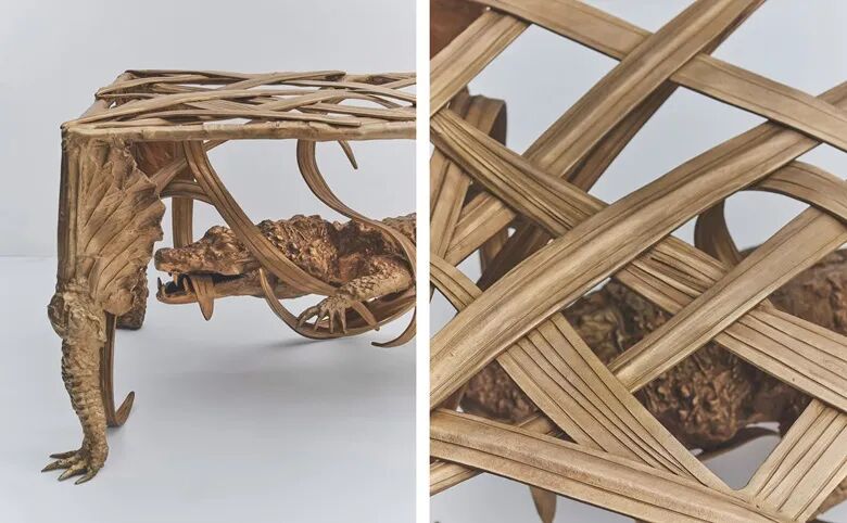 在二人的家中和旁边的花园里,可能看到一只兼作台灯的青铜鸟、由公羊角支撑的玻璃桌面,或者在后院里站岗的巨型猴子。法国记者让·科 (Jean Cau) 在1967年为《Vogue》杂志撰写的文章中写道:“一切就像爱丽丝梦游于拉兰内的仙境。兔子和燕麦,烧烤架和小风琴……以蜻蜓翅膀点缀的叉子……诗意在我身边点燃起欢乐的鞭炮。” 这些作品散布于拉兰内夫妇的家里,印证了二人的艺术品能够融入日常生活的追求。克劳德·拉兰内 (1925-2019) 《小型鳄鱼长椅》,2016年制,鎏金铜,43.5 x 143.5 x 64.2 cm., 估价:500,000 - 700,000 美元。此拍品将于12月7日佳士得纽约“雕刻天堂:玛丽·拉兰内珍藏拍卖”中呈献