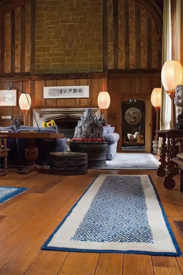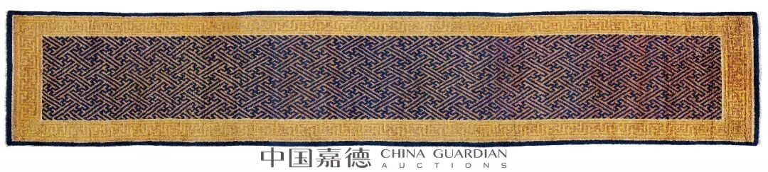 450×80 cm.(177 1/8×31 1/2 in.)走廊毯,长方条状,设两道边,一道藏青色素边,一道棕地万字纹边。毯内锦地卍字纹,在数千年前,人类就以其纹装饰物品。它的美在于把“卍”字的各起点和终点用直线连接,宛如风车,一阵风吹来,风叶旋转不息,可以感受到“卍”字本身的律动感。中国地毯常选用“卍”字纹装饰毯边。莫士辉(Hugh Moss)水松石山房铺陈万字流水纹毯此毯与众不同在于通体饰“卍”字纹,且分别为“卍”字不到头、“卍”字曲水形。前者,它同一朝向,周而复始,循环延续,充满着反复的哲理。后者,利用曲直的线条以对称的形式,在静谧之中蕴含着一种内在的张力和动感,给人予庄重之中不失活泼和自由。毯子用色有深蓝、木红、姜黄、粉色,颜色在运用中采用冷暖色对比法,渲染得纹样端庄典雅,华美高贵,古韵十足,韵味无穷。