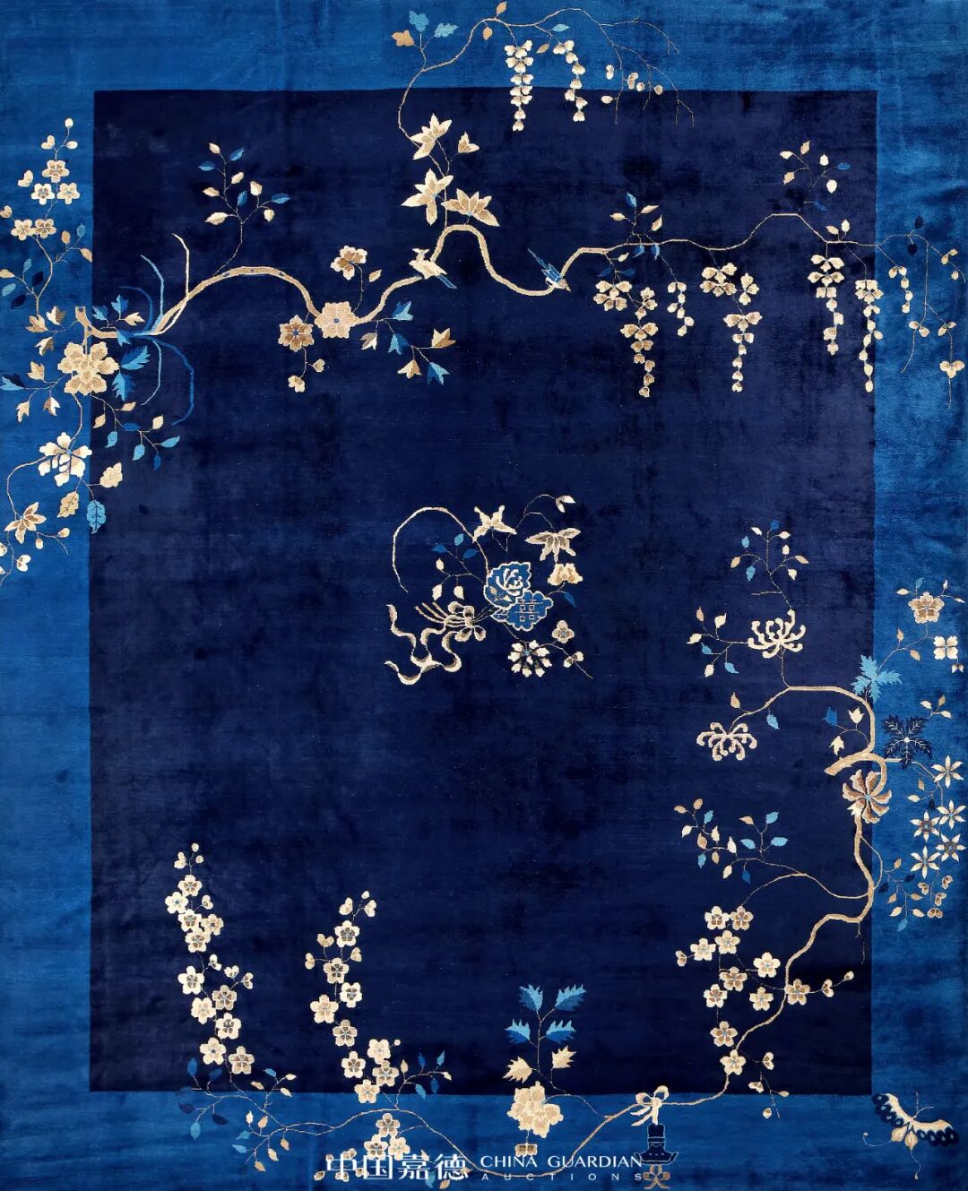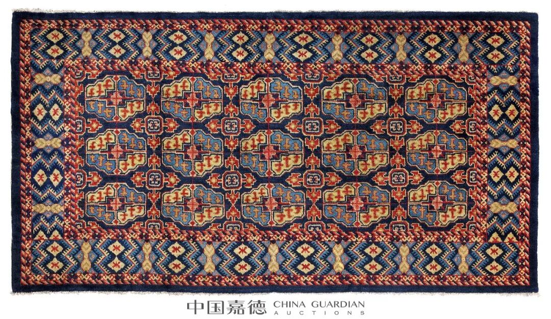毯子尺寸较大,体现了清晚期手工编织地毯的工艺水平。地毯蓝地,设一道边,毯内花纹的构图别有艺术特色,择选传统的题材,但表现手法却十分新颖,富有创意,令观者耳目一新。毯中两片菊叶内双喜字醒目突出,菊花秀美,其旁荷、菊与之相随,枝蔓下端系舞动着的蝴蝶式彩带,令花束韵致有余。毯的一端枝干由劲健渐变至纤细轻柔,曲折蜿蜒至毯边,牡丹、菊、荷、花叶,在线条流畅的枝蔓上或上、或下、或疏、或密地绽放着,喜鹊登枝,有的鸣叫不止,一显鲜花着锦,鸟语花香。毯子的另一端用同样的写实手法装饰纹样,其中束束梅花饱满,清高绝俗。菊之花媚,神韵清奇。毯角的一彩蝶与小盆景,为花束画龙点睛,生动自然,灼人眼目,美意非凡。两端的纹饰如两道花带,相互呼应中相映成趣,秀润清灵,意态绵密,令满毯散发出浓浓的艺术气息。整毯纹样内涵中国传统吉祥文化,表述着幸福、长寿、富贵、和美、春光无限的含义。毯子用色有深蓝、浅蓝、天蓝、月白、棕红、绛红、姜黄、土黄、浅褐、棕色,用色丰富。颜色运用中通过冷暖色对比法,或两晕色法,渲染得纹样生动鲜明,飘逸自如,婀娜多姿,精致耐看。此毯用料上乘,经纬线为棉质,栽绒为羊毛。手工编织,工艺精湛,纹理细腻,起绒较长,色彩纯正。如此独特艺术感染力的毯子,在同时期的古旧地毯中可谓出类拔萃。寓意“白头偕老”、“谊结同心”、“花香鸟鸣”、“富贵美好”、“生机盎然”、“平安吉祥”、“寿元无量”、“子嗣昌盛”。地毯历经一百余年品相完好,弥足珍贵,在古旧栽绒毯中具有很高的欣赏、研究与收藏价值。中国嘉德2022秋拍预展实行线上预约,敬请提前预约后观展。