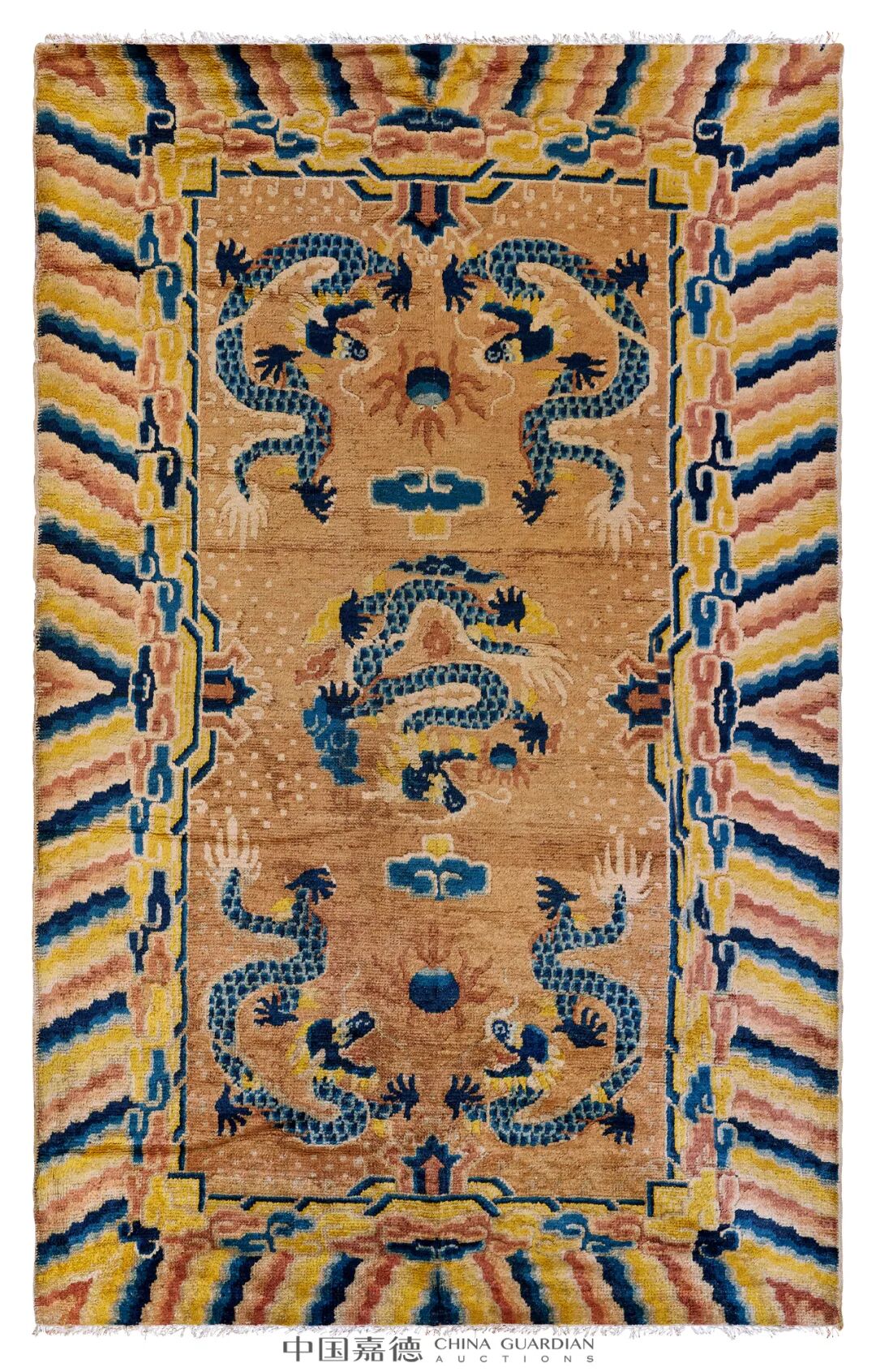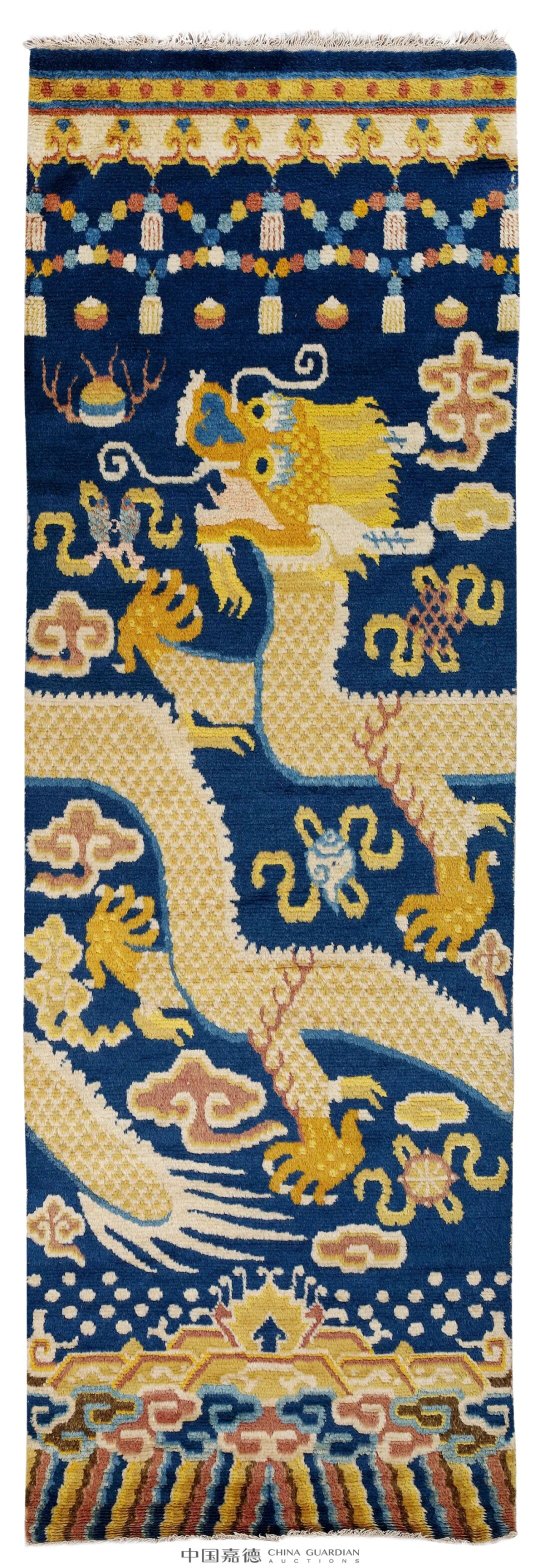 地毯长方形,米黄色地,三道素色窄边,内部以云龙纹为主题纹饰,米黄色地菊花龟背纹,中央蓝色团龙,四角三角形云龙,神龙穿梭云中,祥云纹颇具特色,呈牡丹花状,深、浅二种蓝色晕染,过渡自然,整毯端庄富丽。包头毯的特点是以金丝织底,用染色真丝搓线织成各种图案。盘金线是栽绒毯中的一道特殊工艺,系指在毯面不显花的部位,以金线或银线,在毯的经线横向缠绕,以此形成“人”字纹的金、银色毯面,金光闪烁,颇为华丽。![]()