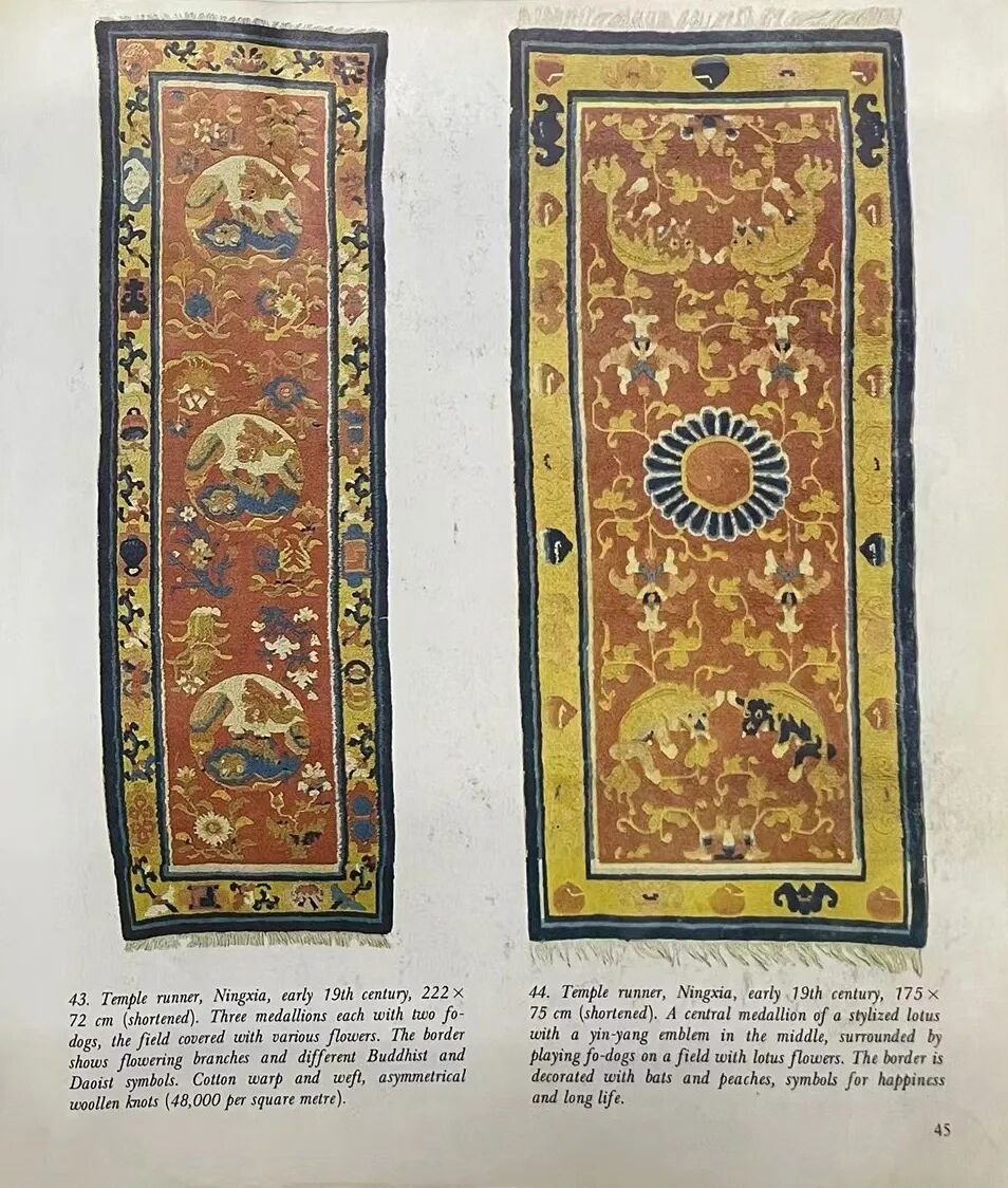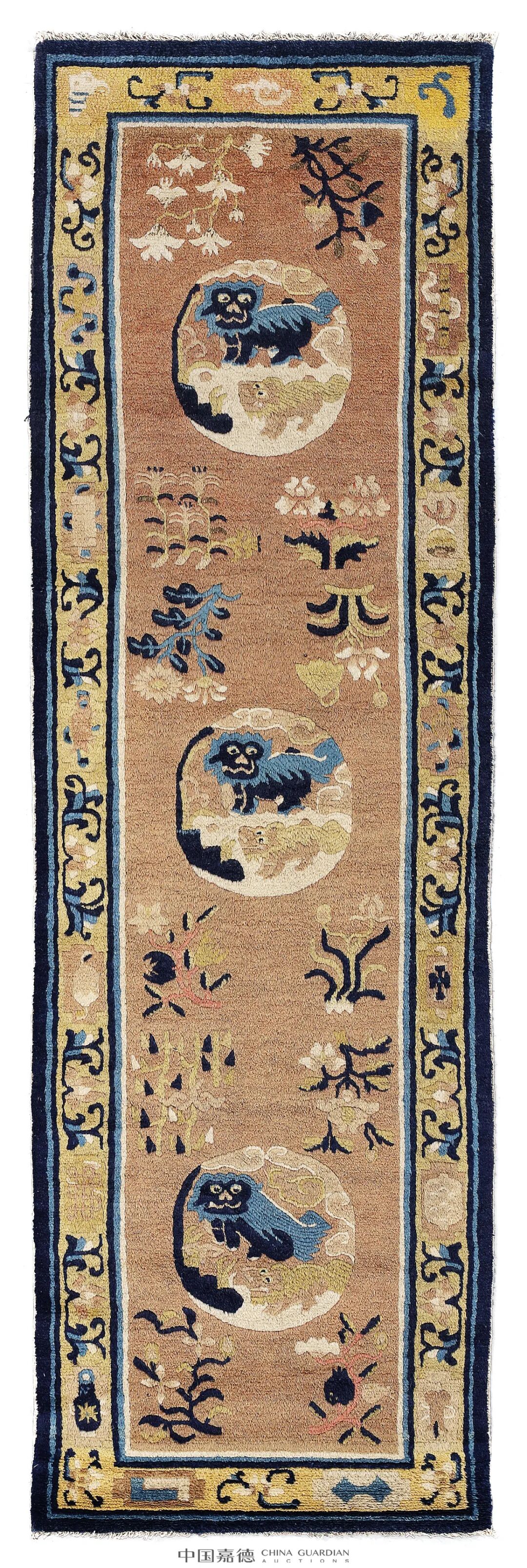 走廊毯,条状长方形,四周三道毯边,从外向内第一道为深浅双蓝色素边,第二道黄地花卉、寿桃、如意、宝瓶纹环饰,最内第三道为深浅双蓝与白色素边,毯心棕地,温柔淡雅,其上三连团形太狮、少狮纹,狮子鬃毛浓密,是为雪地狮形象,团狮纹周边佛手、石榴及梅兰竹菊等花卉纹环绕,色泽清雅协调。此毯棕红地,颜色华美,颇为少见,而更为珍贵。毯呈长条形,应铺设于走廊、连廊等空间的走廊毯。参阅:Lennart Larsson jr., Carpets from China Xinjiang &Tibet, Hongkong: Oxford University Press, P45, No.43,1989.(伦纳特·拉尔松:《中国新疆西藏地毯》,香港,牛津大学出版社,第45页,第43号图版,1989年)。![]()
