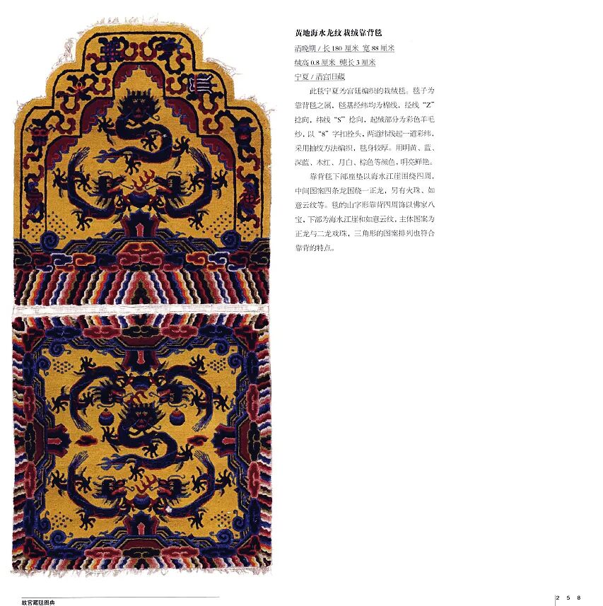 此为靠背毯,近似“山”字形,设两道边,毯边饰法螺等佛教法器。毯内中心编织龙纹图案,正龙、飞龙皆为五爪,毯下饰海水江崖纹。毯子棕色地,又用明黄、藏蓝、天蓝、月白等颜色,主要通过冷暖色对比法,或两晕色法,渲染得花纹端庄大气,古香古色,疏秀明洁,古朴典雅。此毯用料上乘,经纬线为棉质,栽绒为羊毛,棉线、羊毛均为手捻。手工编织,起绒较长,工艺精湛,纹理清晰。植物染色,色彩纯正牢固。毯子纹饰具有时代特征,工艺具有地域特点。毯边的处理是宁夏独有的工艺。毯子工艺复杂,其边缘依靠背椅的形状而编织,清代当属宁夏编织此类毯技术娴熟,堪称一绝。参阅:《故宫藏毯图典》,第258页,清晚期 黄地海水龙纹栽绒靠背毯162×99 cm.(63 3/4×38 1/2 in.)