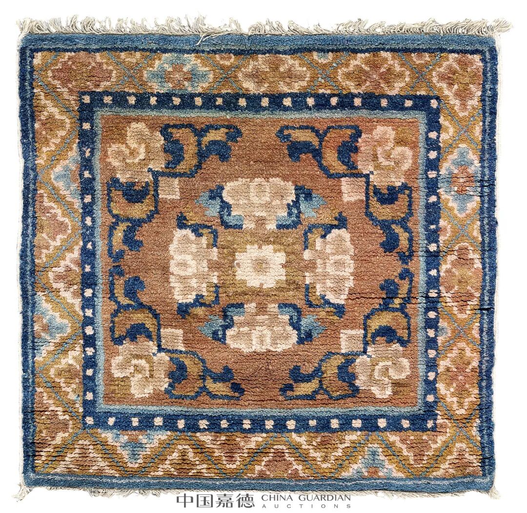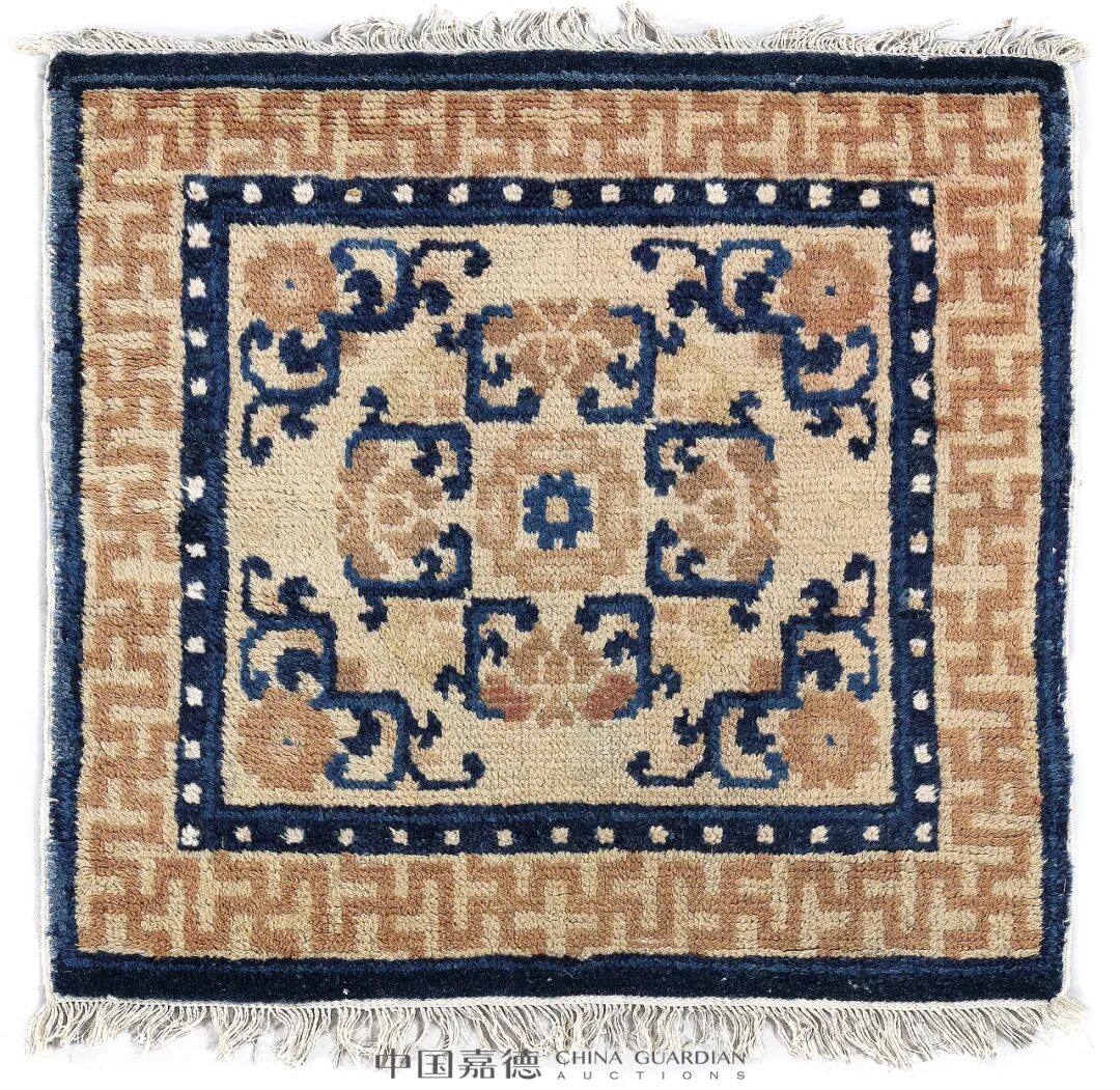 54×52.5 cm. (21 1/4×20 5/8 in.)此件禅毯近方形,上下垂自然流苏,以黄棕色为地色,由外向内三道边, 最外为深浅蓝双色素窄边,向内菱形变体海棠花纹宽边,粉、兰 双色花,向内深浅蓝窄边,其上饰白色连珠纹,毯心缠枝莲团花,四角亦饰缠枝莲纹,庄严静穆。禅毯棉线经纬,羊毛栽绒,纹饰清晰,色泽丰富典雅,依据方毯 尺寸、纹饰可推断,其原应置于宝座或禅椅一类较大的坐具之上。54.5×51 cm.(21 1/2×20 1/8 in.)禅毯近方形,设三道边,外为藏蓝色素边,中间为卍字纹大边,内为深浅蓝双色素窄边,并饰摩尼珠纹。整毯以米黄色为地色,毯内饰缠枝莲纹,枝叶为藏蓝色,花头为木红色,是极为稀少的用色。缠枝莲与卍字纹一起,寓意生生不息,团圆和满。满毯纹样规矩有序,密而不乱。构图具有几何纹特征,使图案成为一个整体。可谓纹饰明晰,色泽清丽典雅。禅用料上乘,经纬线为棉质,栽绒为羊毛,棉线、羊毛线均为手捻,手工编织,植物染色,色彩牢固,毯面富有光泽。特别是毯中木红和棕色,为宁夏栽绒毯早中期的代表颜色,更彰显此毯古色古香。![]()