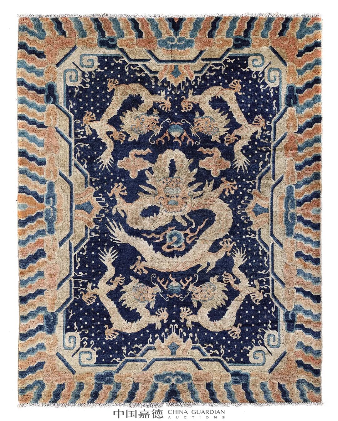 蓝地五龙海水江崖纹裁绒地毯