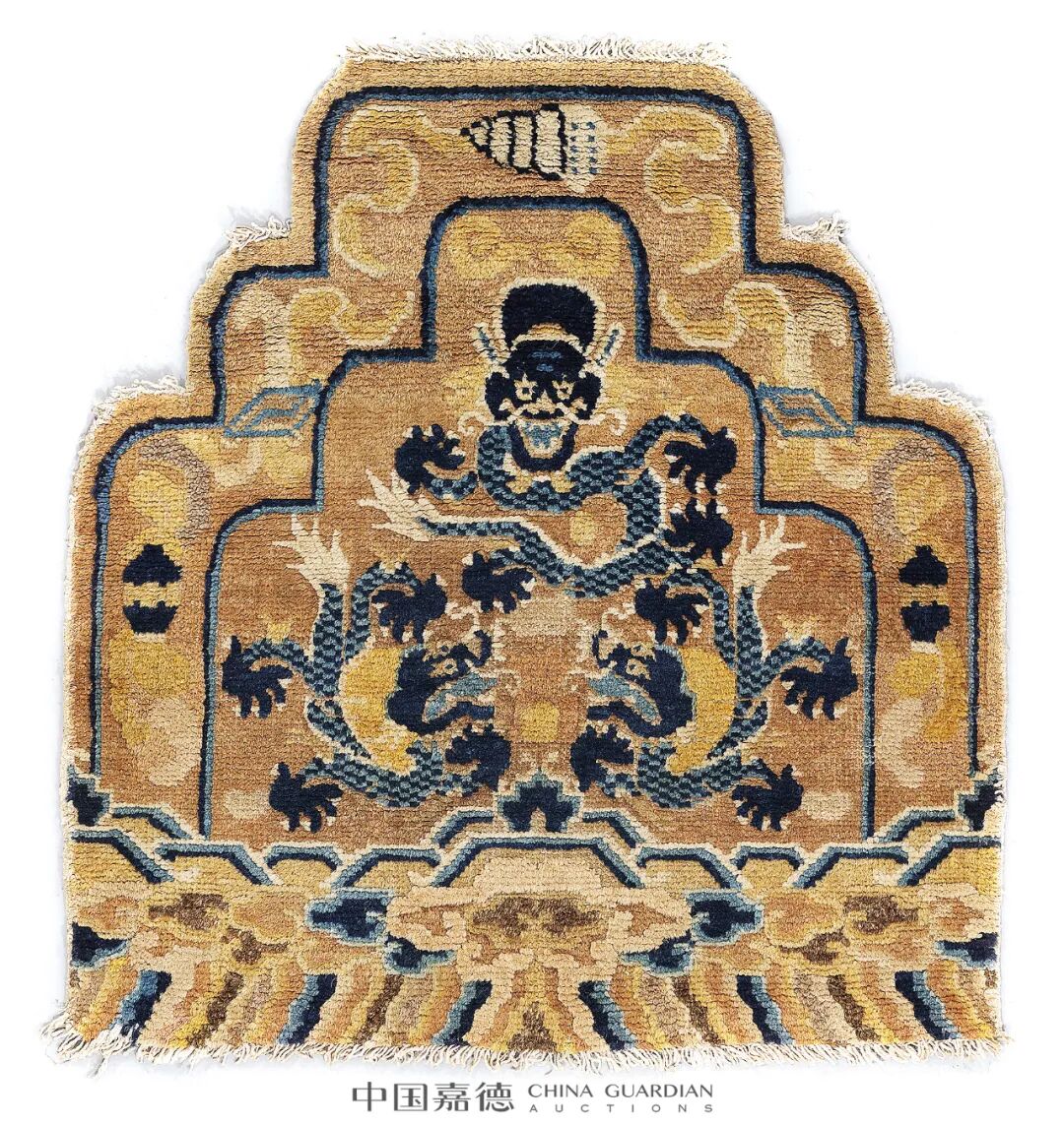 此毯为佛教寺院用于包裹柱子的栽绒毯,当为皇家所制,用于捐赐寺院。与一般栽绒地毯不同之处有二:一是纹饰设计更难,将毯包裹柱子时亦不能影响图案美观;二是其纹饰宗教意味浓厚。如本毯中,龙在藏传佛教中是神灵的坐骑和守护神,宝伞守护佛法,用来遮蔽魔障,海水江崖纹则喻当朝江山永固。此毯品相完好,用料上乘,经纬线为棉质,栽绒为羊毛,手工编织,纹理清晰,起绒较长,植物染色,色彩纯正,毯面富有光泽。其图案疏朗,设色繁复,采用木红、蓝、黄、绿、白、香色等,浅色勾边,并采用冷暖对比和两晕色技法,彰显纹饰雅丽多彩,亦不失庄重威严,藏传佛教艺术气息浓厚,与寺院建筑风貌、经堂内景布置相得益彰。此件龙抱柱,与2020 年秋季拍卖会《雕文织采-匠心纺珍藏古代地毯专场》中的Lot 3749 清嘉庆 龙纹栽绒抱柱毯为一对,历经两年,巧合寻到。![]()
