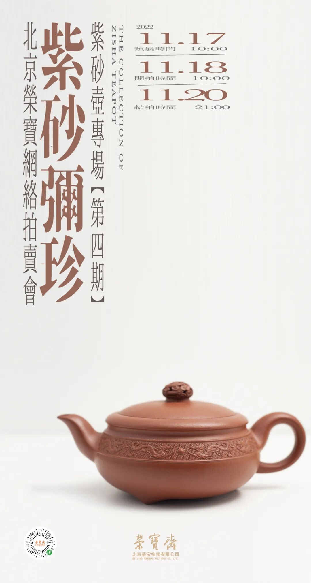 北京荣宝——紫砂弥珍·紫砂壶专场网络拍卖会(第四期)将于11月17日10:00—11月18日10:00开启线上预展,并于11月18日10:00开拍,11月20日21:00结拍。