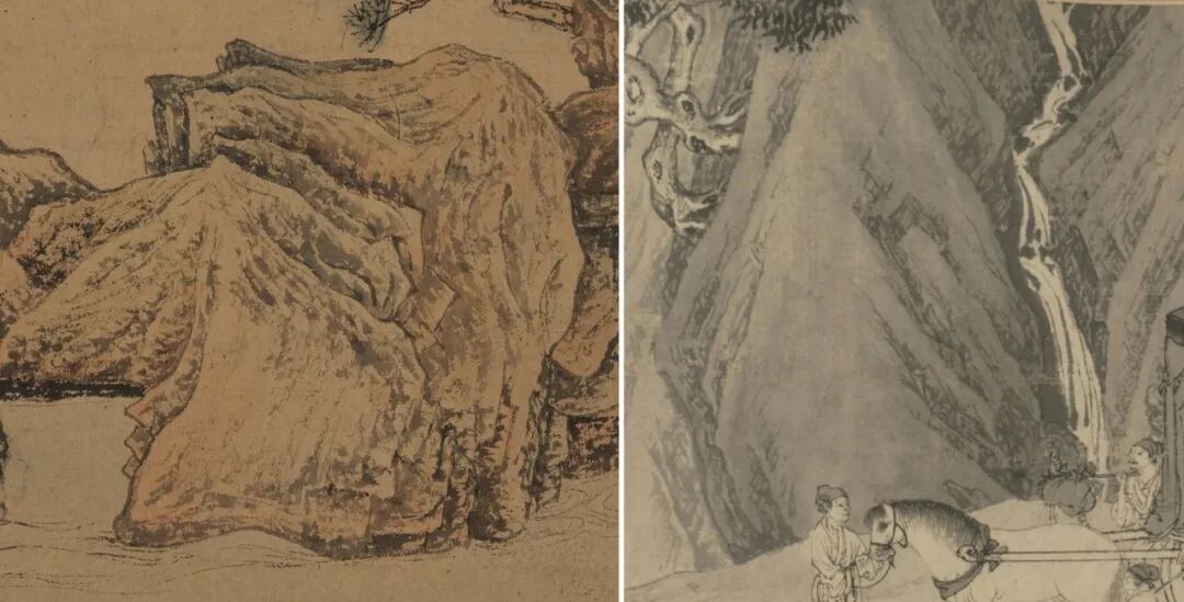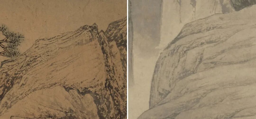 《松冈图》创作年代的下限在唐寅四十二岁,因为文徵明题引首时署款为“文壁”,这是他四十二岁前的署名,之后他便以字行,更名文徵明了。唐寅与文徵明同庚,通常画作还要早于引首和题跋完成,所以这幅画唐寅最晚作于正德六年(1511年),他四十二岁时。那么还能不能更进一步明确创作年份呢?这还是要从画风去作分析。显然,作为别号图的《松冈图》唐寅选择文雅的吴门山水画风来表达。画作于纸本,小手卷形式,无论山石、松树、茅亭、人物全以细笔干墨钩写,层层皴染,最后浅绛渲青赋色,气度闲雅。松树的画法是典型的吴门手法,主干以干淡之墨、细笔中锋,顺着松树生长的走势且钩勒轮廓且圈画树皮,松针以灵动颖脱的中锋笔尖去挑趯。再于干上赋赭墨,叶上赋汁绿。松树的姿态或高耸入云,或盘曲婀娜,或欹侧摇曳。九株松树略成扇形排布,环绕着主人公的读书处,有种蔚然深秀的气势。唐寅后期的院体风格山水也常作松树,主干用两道粗重的墨线勾勒,其馀皴染勾线也都以湿笔重墨。松针用粗实的笔致钩写成一丛丛,在视觉上便形成一个个墨块。两种画法相较而言,松冈之松虬曲而不失松秀,是文雅的态度。而院体风格下的松树则更有苍劲之致。至于此卷山石的皴法则是出于唐寅的独创。唐寅很早就创造出一种以中锋作细劲方折的皴法,并且常将皴笔平行排列,以求装饰趣味。这种皴法从唐寅早期吴门画风的作品中萌芽,在每件作品中表现得都不尽相同,不断发展变化,因方折劲健和富于装饰趣味而与沈、文的笔墨语言很不相同,故而具有很高的辨识度。这种皴法渐至到了后期发展成湿笔长线,与其院体风格相交融,替代了南宋人的斧劈皴,从而使得作品更具唐寅独创的风貌。从唐寅早期已知年份的几件作品,可以看到这种皴法的变化脉络,从1505年,三十六岁所作《南游图》(美国弗里尔博物馆藏),到1506年,三十七岁所作《王鏊拜相图》(故宫博物院藏)到约在1507至1509之间所作《款鹤图》(上海博物馆藏),再到这件《松冈图》。由图七可见,唐寅三十六岁所作的《南游图》几乎还全是以吴门画派主流的表现手法,山石结构是圆转的,皴用披麻,树用夹叶,其气质是文雅温润的。到了次年的《王鏊拜相图》便发生了变化,同样是表现吴地的山石,此作中出现了凸起的尖顶,同时皴笔也变得方折起来。他用细劲的长线把山石的结构分割成一个叠一个的矩形,然后在其中再用小笔作折带皴交错排布,仿佛在凹陷处打着一个个小十字,以加强结构处的表现(图八)。虽说《王鏊拜相图》中的皴笔已经方折起来,但若与稍晚的《款鹤图》相比,那么《拜相图》还只能算圆中带方,方圆相济。《款鹤图》的实验性在唐寅早期画作中是突出的。他有意识将山石的形概括成有棱角的多边形,皴笔方折且平行排列,每一笔之间的空距都好像是相等的,甚至连山涧的水流也是等距离排布(图九)。这样的画法让人联想到钱选,这位元初大师在他的《浮玉山居图》种创造出了一种极具装饰趣味的古拙画风,那正是唐寅在《款鹤图》中所借鉴的。吴门画派主要是继承了元末四家黄王倪吴的风格及趣味,对钱选画风的继承似乎只有唐寅一人。《款鹤图》的实验当然是唐寅寻求突破时风的尝试,一方面他把皴笔变得劲挺方折是为了突破吴门温婉圆转的主流气质,另一方面,他追求夸张的装饰趣味是为标新立异、博人眼球。《松冈图》显然是晚于《拜相》《款鹤》两图的创作,因为相比而言,《松冈图》的造型及笔墨语言都显得更加成熟了。在《拜相》《款鹤》锐意求变之后,唐寅在《松冈图》中不再采用夸张的表现手法以求突破了,而是以更恰当的,贴合表现对象的手法。南京的松冈唐寅或许亲历过,因市场上还出现过一件唐寅为进卿所作的泥金扇面,其上署款“吴趋唐寅寓金陵为松冈杨先生写”。可见唐寅曾在金陵为杨进卿作画,因而亲历过松冈是极有可能的。松冈的地貌不是江南常见的土质小丘,而是方折嶙峋的巨岩横亘于水中。起首巨岩层层叠叠向纵深推进,四角嶙峋突起,唐寅用侧笔横拖,笔致极干淡细劲,循结构钩写出石之筋骨。山头作些横略的笔道,多线平行排列,此与《拜相图》中手法相仿(图十)。而与《拜相图》不同的是,《松冈图》中增添了相当比重的侧锋刮擦的皴笔,特别是在平行的结构线之间用笔腹刮擦的手法,且多层次皴染,能见到几种不同浓淡的墨色作侧笔擦染,表现出结构的深陷处,或是石上的小凹面。《拜相图》中的皴笔几乎都是中锋书写而出,灵动的长折线、短折线相互叠加,侧笔很少用,擦染更是几乎不见(图十一)。显见《松冈图》的皴法更加丰富、多变,正侧锋转换更加自由。画卷中央有一块巨石犹如狻猊蹲踞于水中,巨石的阳面,唐寅以许多极干淡的细线拖拉皴擦,仿佛勾画出巨兽背部的动纹。巨石左下部层层推进的阴面好似巨兽的下颌,侧笔刮染规律地铺陈,表现出结构的转折(图十二)。《松冈图》的用纸是熟且略有纸筋的,所以皴笔在纸面上运行多有毛涩感。山石的轮廓和结构的肯綮处,唐寅用浓墨做了复勾,甚至是用焦墨再加重皴染,以提醒结构。正是恰到好处地用焦墨勾勒轮廓和石筋,以及中锋细劲的方折皴与侧笔刮擦的多层次叠加、皴染,塑造出松冈山岩的体积感,很好地表现出松冈岩石坚实度和沧桑感,加之赭红的赋色,与南京郊外多见的层叠结构红土地貌确实十分