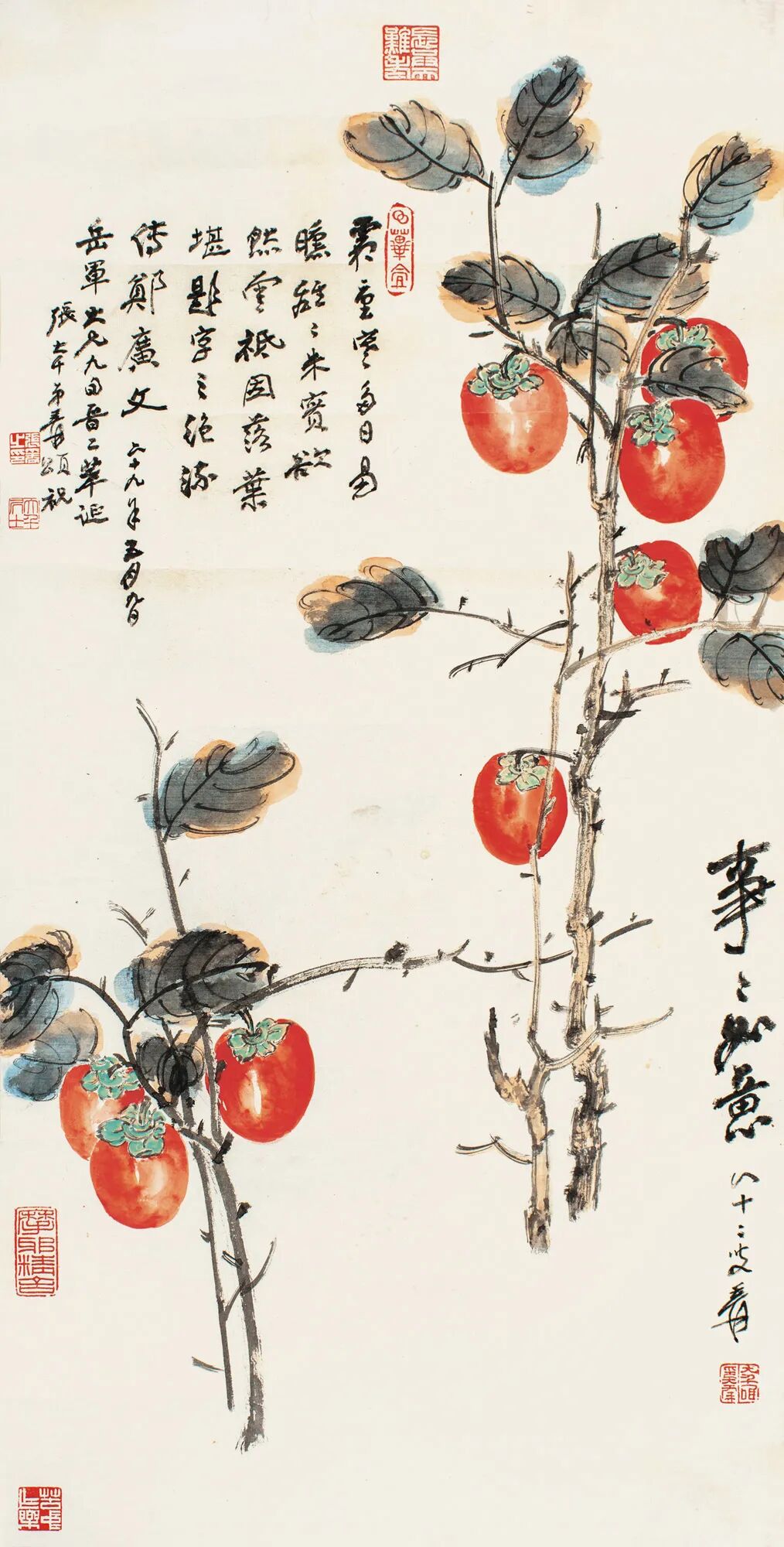 2.霜重寒多日易曛,离离朱实欲然云。只因落叶堪题字,三绝流传郑广文。六十九年五月九日,岳军大兄九旬晋二华诞,张大千弟爰颂祝。