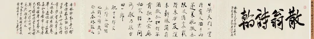尾跋:右林师散之老人楷书诗翰真迹,散师以草法名世,而其楷书之妙实为草法之根基,试看斯卷笔笔遒健,字字庄严,真如面对古之贤者,绝非俗笔可摹也。先生传世作草多而楷鲜,如此佳品则罕所见也,识者珍之。癸巳春二月,观识于石头城爱莲居中,戈父萧平。钤印:萧平、爱莲居